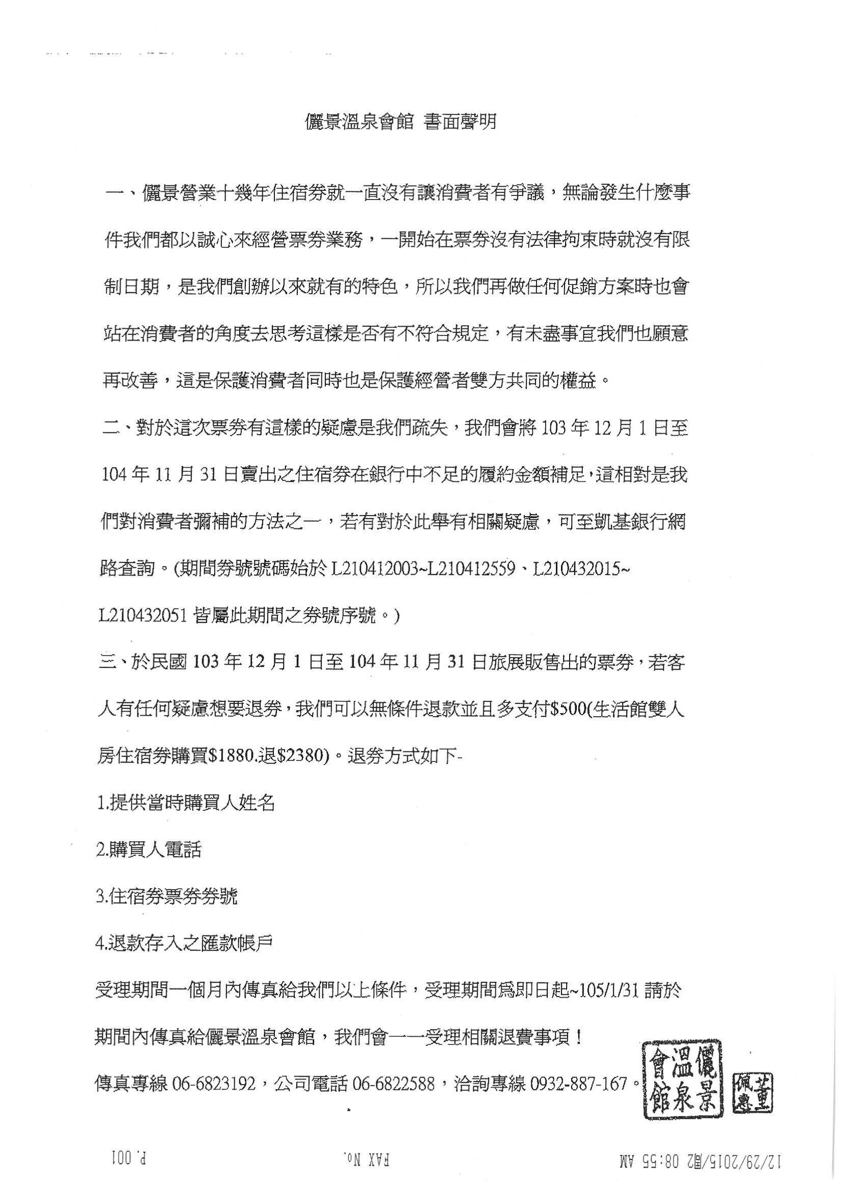 台中市政府消保官日前於旅展會場發現台南儷景溫泉會館所販售住宿券,雖有銀行履約保證記載,但無銀行戳章或防偽標章,經查證該批禮券並未辦理信託,因涉偽造文書刑責,成為全國首宗因履約保證記載不實,被移送司法機關偵辦案件。市府法制局表示,業者已同意將103年12月1日後所販售禮券,全數補足法定1年的履約保證,並同意無條件退費及提供500元現金賠償機制。