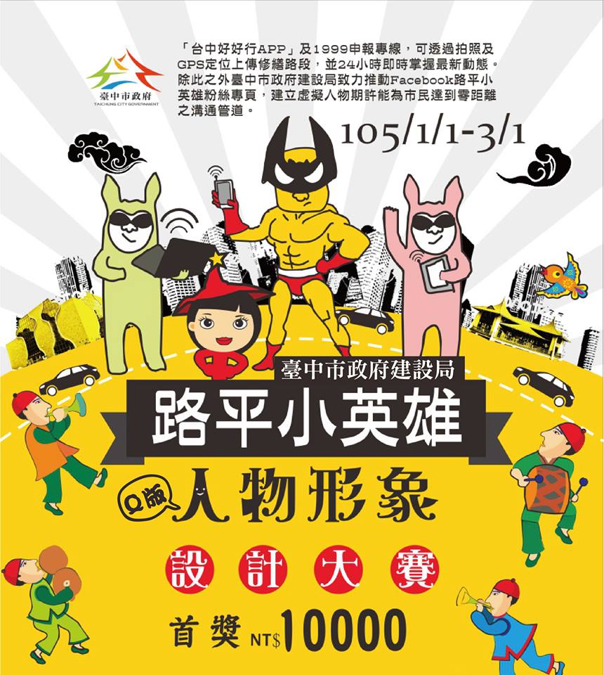 「路平專案」代表人物圖樣即日起在市府建設局「路平小英雄」臉書專頁公開徵選,收件截止至3月1日,參賽者不限單人或團體,參賽作品需緊扣路平十大要領的內容,以各種圖案、同一人物主角呈現。