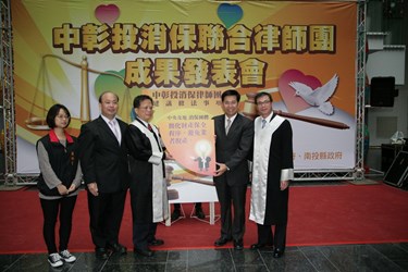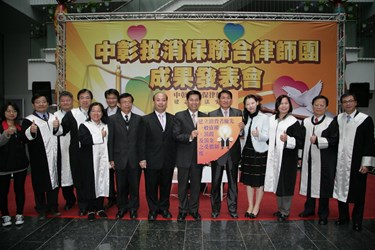中彰投消保聯合律師團今(8)日於台灣大道市政大樓舉辦成果發表記者會,由副市長潘文忠、彰化縣副縣長陳善報、市府法制局長陳朝建、法制局主任消保官康馨壬、彰化縣政府法制處長黃耀南、彰化縣消保官張啟昱、南投縣消保官許麗貞及聯合律師團9位律師等人,共同宣布包括「中央及地方政府機關得提起團體訴訟」、「消保團體之公益訴訟以及消費者保護基金之設置」、「簡化財產保全程序,避免業者脫產」、「建立消費者優先一般債權、罰鍰及罰金之受償程序」等消保法4大修正建議,希望行政院列入消保法之修正參考,與消費者站在同一陣線,對抗黑心業者。