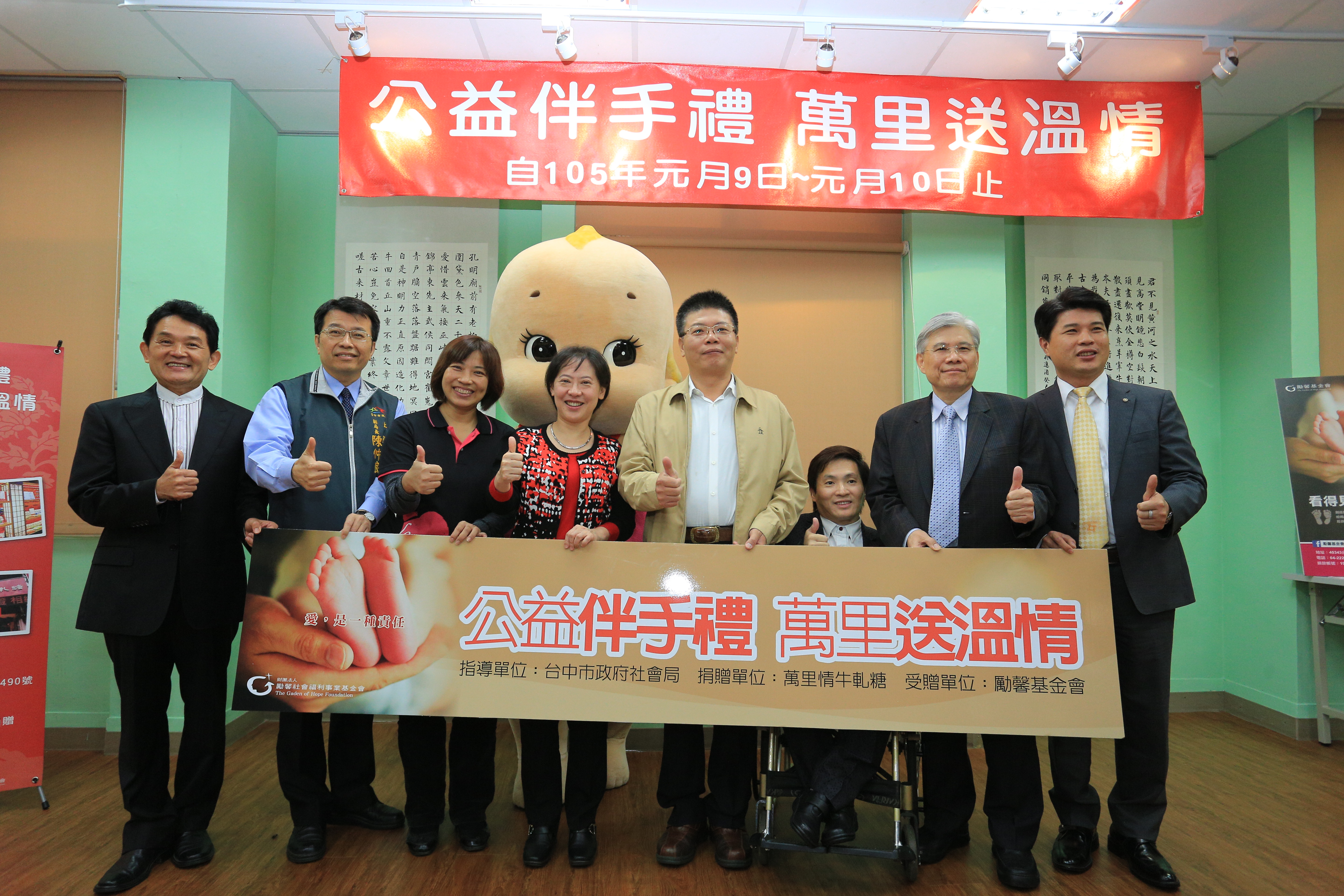 「萬里晴送溫情愛心義賣守護小腳ㄚ」義賣活動今(8)日在台中女兒館舉辦記者會,由代表守護小寶寶的「丘比娃娃」熱舞開場,現場氣氛溫馨感人。市長夫人廖婉如與社會局副局長陳仲良受邀出席,萬里晴食品有限公司總經理吳炎山、台中勵馨基金會主任馬梅芬、台中市糕餅公會理事長周子良、丘比公司董事長楊進雄、工商發展投資策進會總幹事何敏豪等人也到場共襄盛舉。