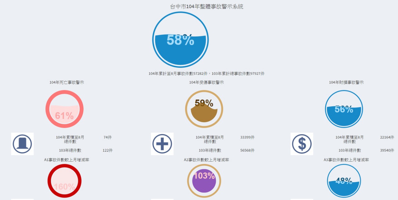 王局長指出,台中市首創「易肇事路口整合平台」,透過大數據分析肇事資料,運用平台儀錶板介面呈現肇事熱點、斑點圖、車禍態樣、易肇事族群及時空分布等資訊,將肇事資料透明化、防制管理網路化。