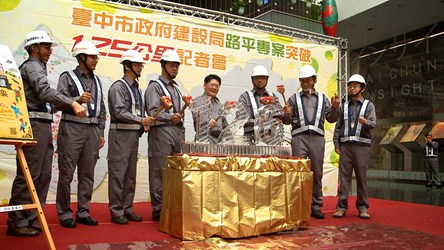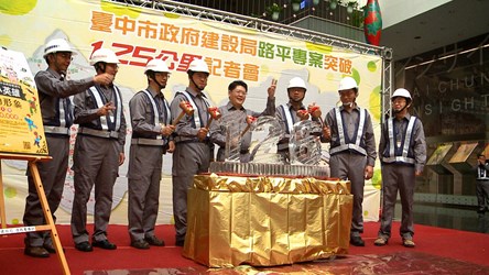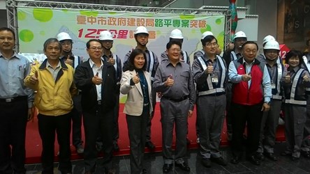 台中市政府施作路平公里數已突破126公里,市府建設局今(12)日舉行路平達標記者會,除公布目前成果外,具有專業精神的路平制服也首度公開亮相;在建設局長黃玉霖的帶領下,敲破數字126冰磚,宣示路平首年已突破126公里,未來將持續進行,朝4年500公里目標努力。