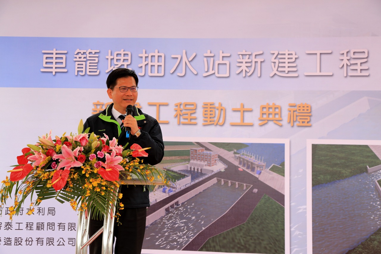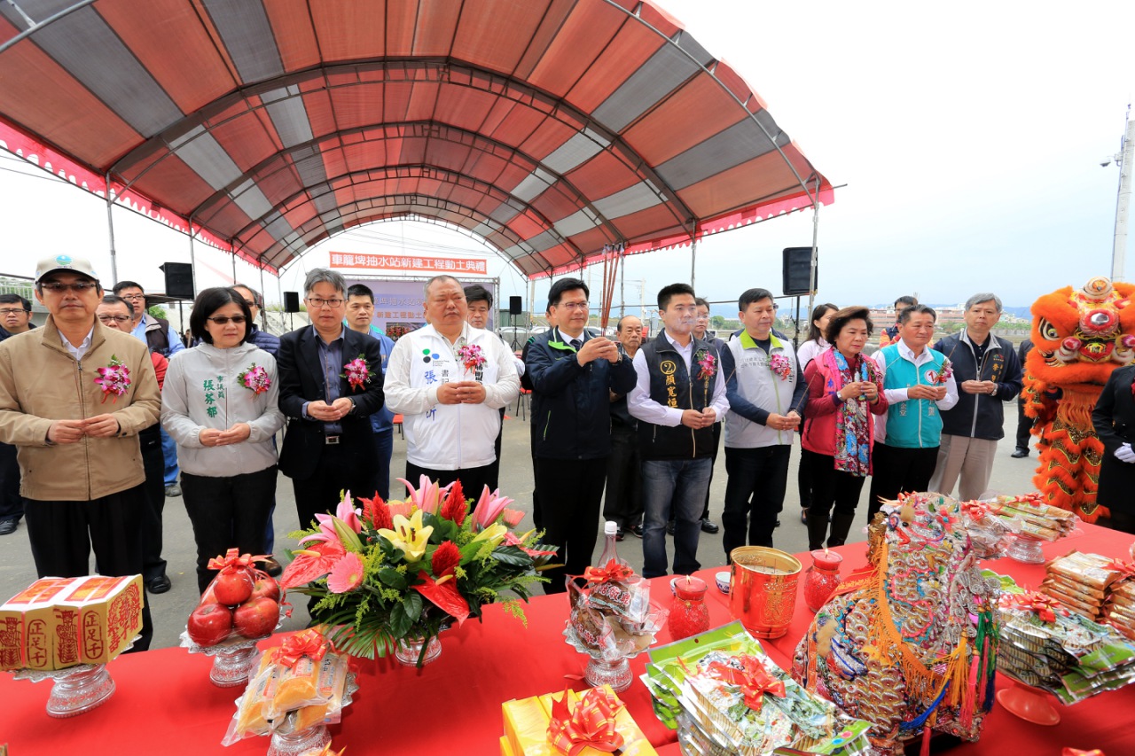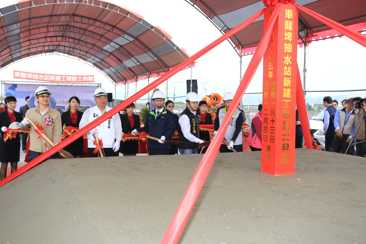 市府水利局爭取中央支持,並編列1億元預算興建車籠埤抽水站,今(13)日舉行動土典禮,現場敲鑼打鼓,舞獅熱鬧開場,以「福地祥瑞、動土大吉」對聯祈求動土順利。市長林佳龍在水利局長周廷彰陪同下巡查當地水況,水利署第三河川局長楊人傑、議員林碧秀、張芬郁、張滄沂、李天生、陳世凱及立委顏寬恒、前立委顏清標等人也到場關心。