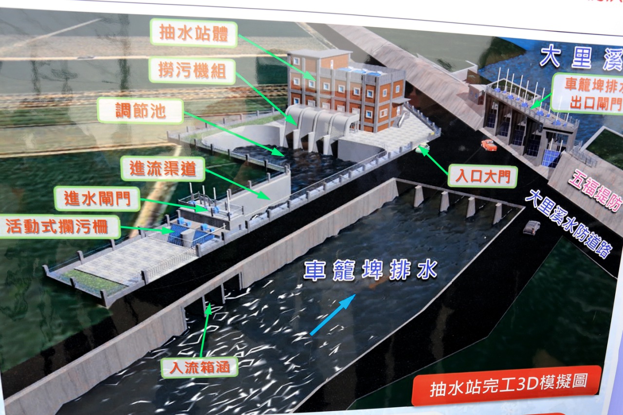 周局長表示,五福里、四德里鄰近地區剛好位處大里溪下游,地勢低窪,加上排水路通水斷面不足,以及部分護岸老舊毀損、高度不足,水患災情長年不斷;因此,水利局特別拓寬車籠埤排水渠道、加高提防,並陸續興建樹王埤、中興段及后溪底3座抽水站,預計今年底車籠埤抽水站完工,將徹底解決水患問題。