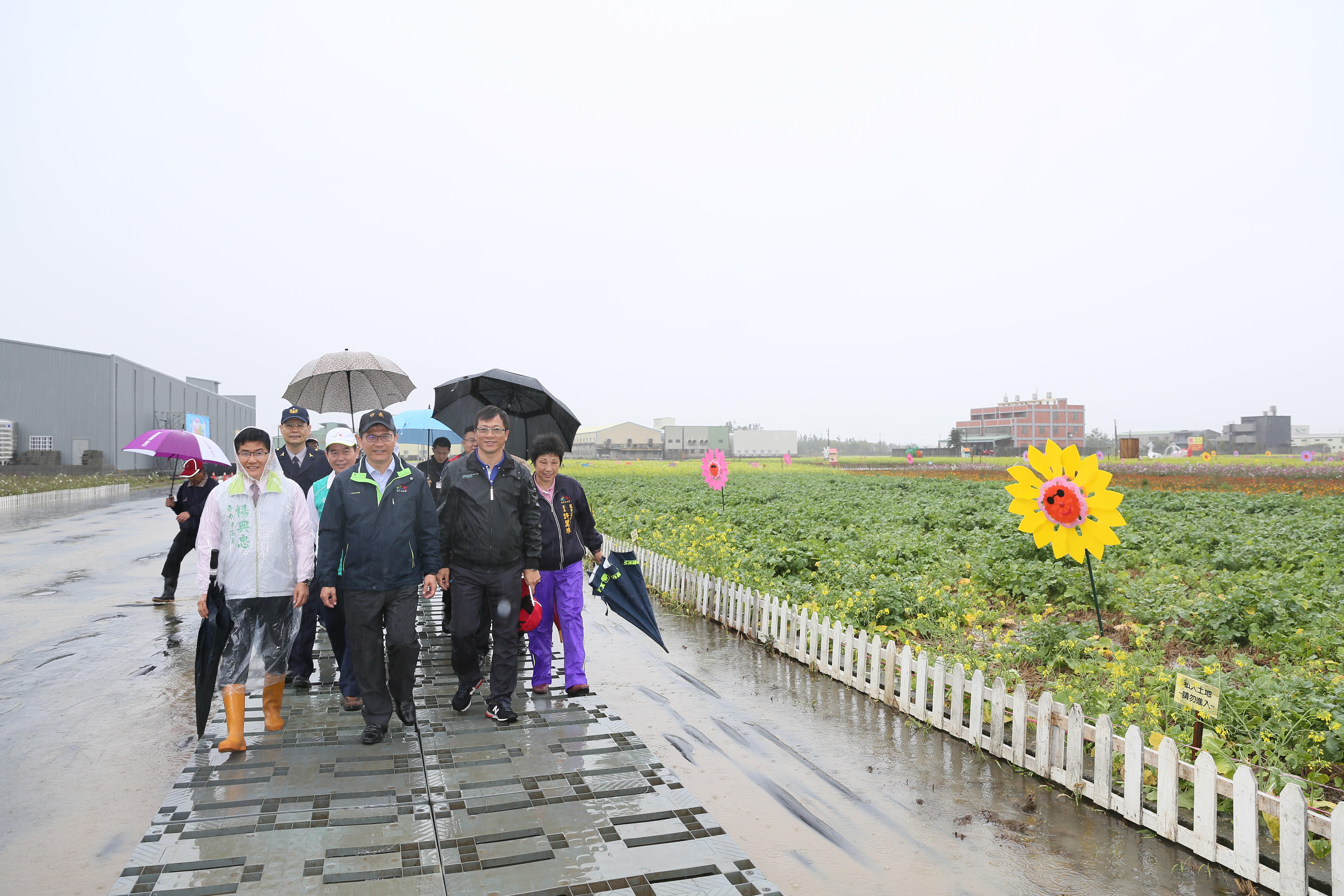 今日雖然下起大雨,林市長仍與農業局長王俊雄、市議員楊典忠、吳敏濟、龍井區農會總幹事林裕議等人到龍井區「看見臺中花田季」現場視察。大雨中,大波斯菊、黃波斯菊及百日草等依然盛開,黃、白花海一片,相當美麗。