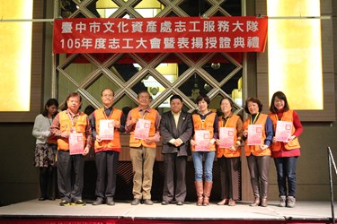 台中市文化資產處志工服務大隊共分為山城、海線、屯區及中區等四個支隊,志工人數150人,文化局今(17)日舉行授證頒獎典禮,陳彥玲、李美齡二位志工獲「年度特別獎」,文化局副局長施純福代表頒獎,感謝志工一年辛苦付出,因為有志工的解說服務,讓民眾更能了解台中許許多多的故事。