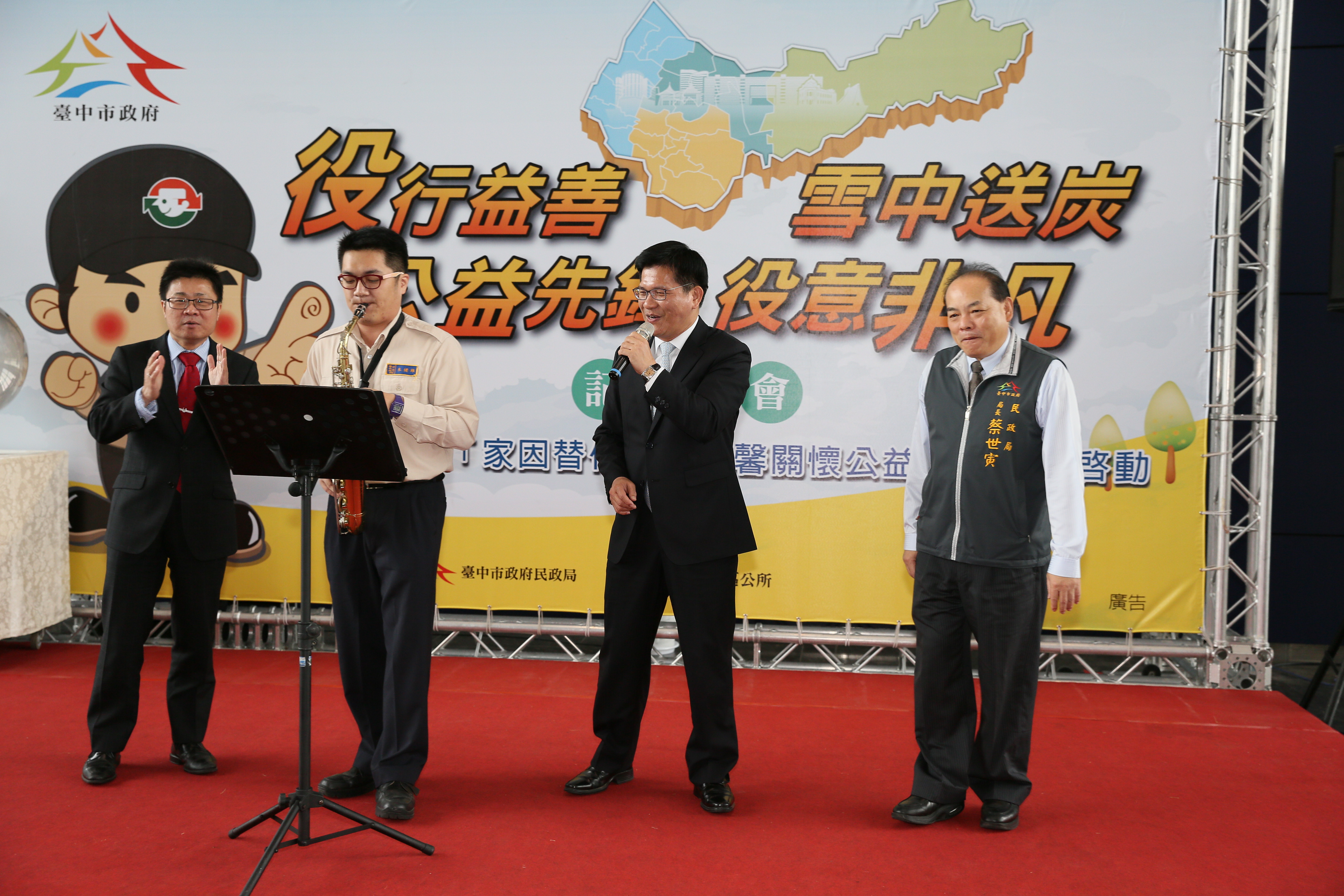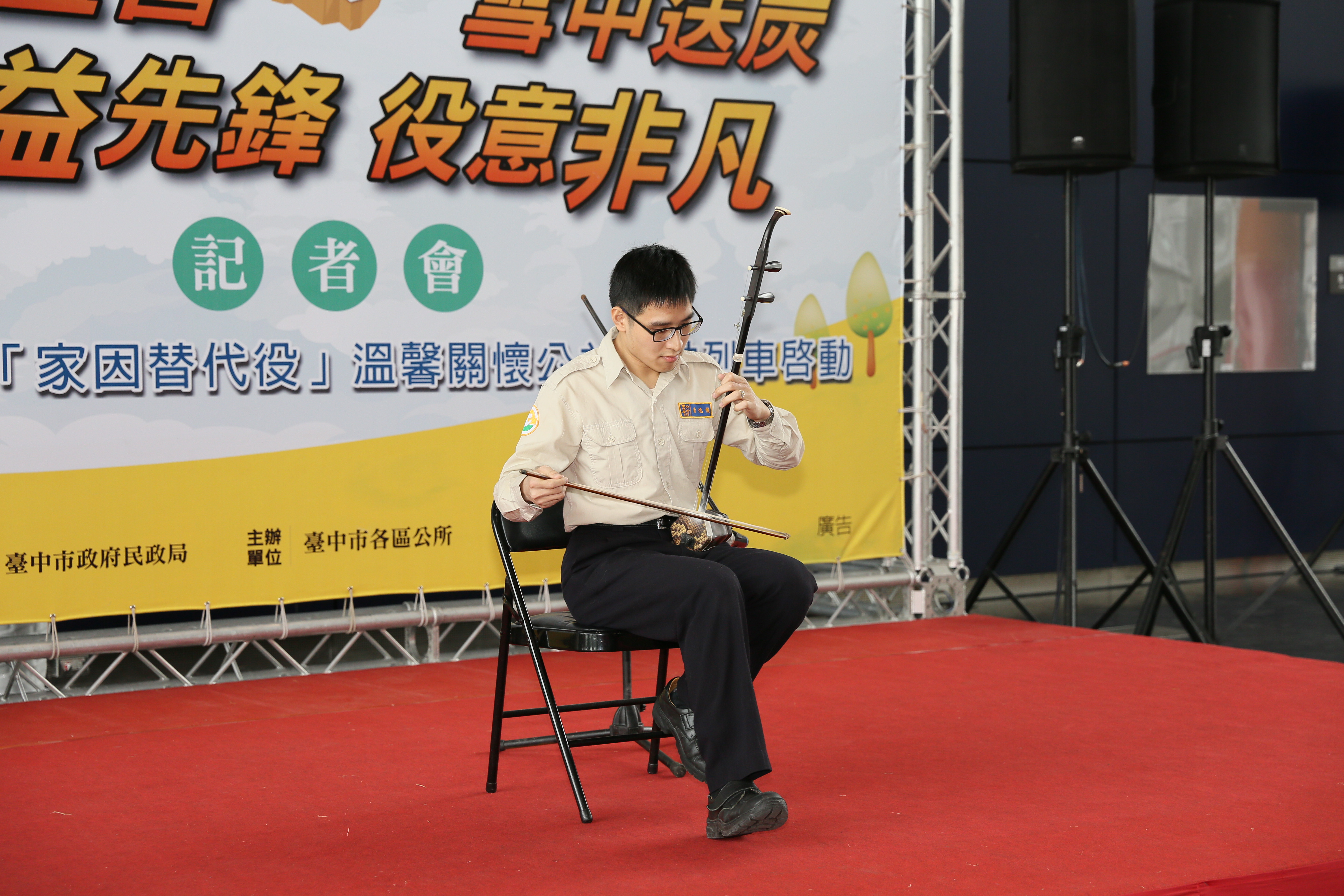 市府民政局今(19)日於台灣大道市政大樓舉辦記者會,役男們以薩克斯風及二胡演奏「月亮代表我的心」、「望春風」等經典曲目,市長林佳龍、民政局長蔡世寅、社會局長呂建德等人也受邀上台,在役男的樂器伴奏下,合唱「快樂的出航」,氣氛熱鬧愉快。