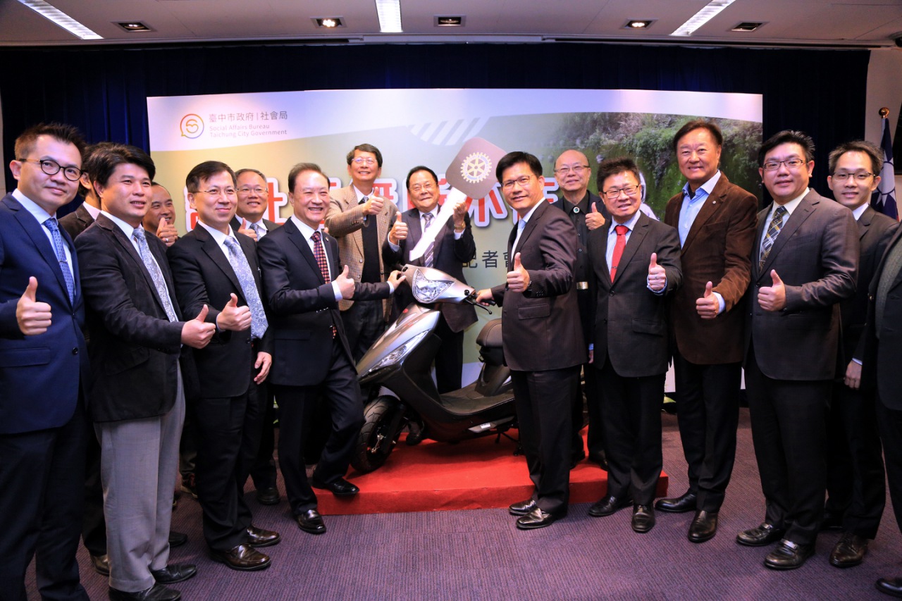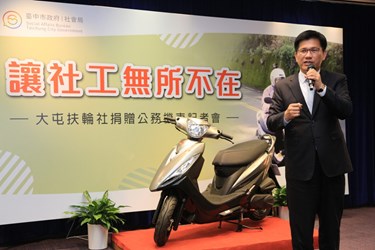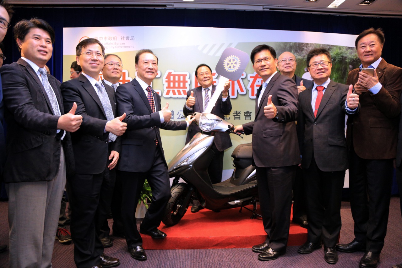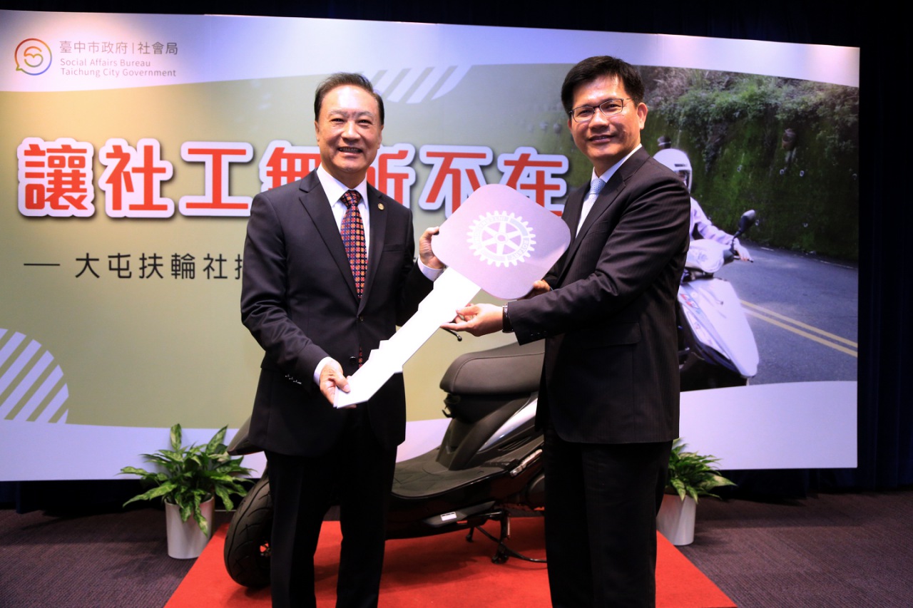 台中市政府社會局設置9個家庭服務中心,針對社區經濟弱勢及高風險個案家庭,提供在地、及時的訪視協助,但服務範圍幅員廣大,公務機車數量不足,大屯扶輪社因此捐贈10台機車給社會局。市長林佳龍感謝扶輪社無私捐贈,以機車代替金錢,將讓愛心力量更大、散播更遠,實際幫助到每一個弱勢家庭。