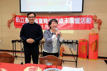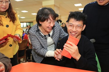市長夫人親切問候在場的院生,並致贈愛的小紅包,一份一份親自送到每位院生手中,祝福大家新年快樂;院生們也將親手捏製的陶藝作品送給市長夫人紀念;市長夫人也與大家一同用餐,親切地為院生夾菜,讓圍爐的菜色更為美味。