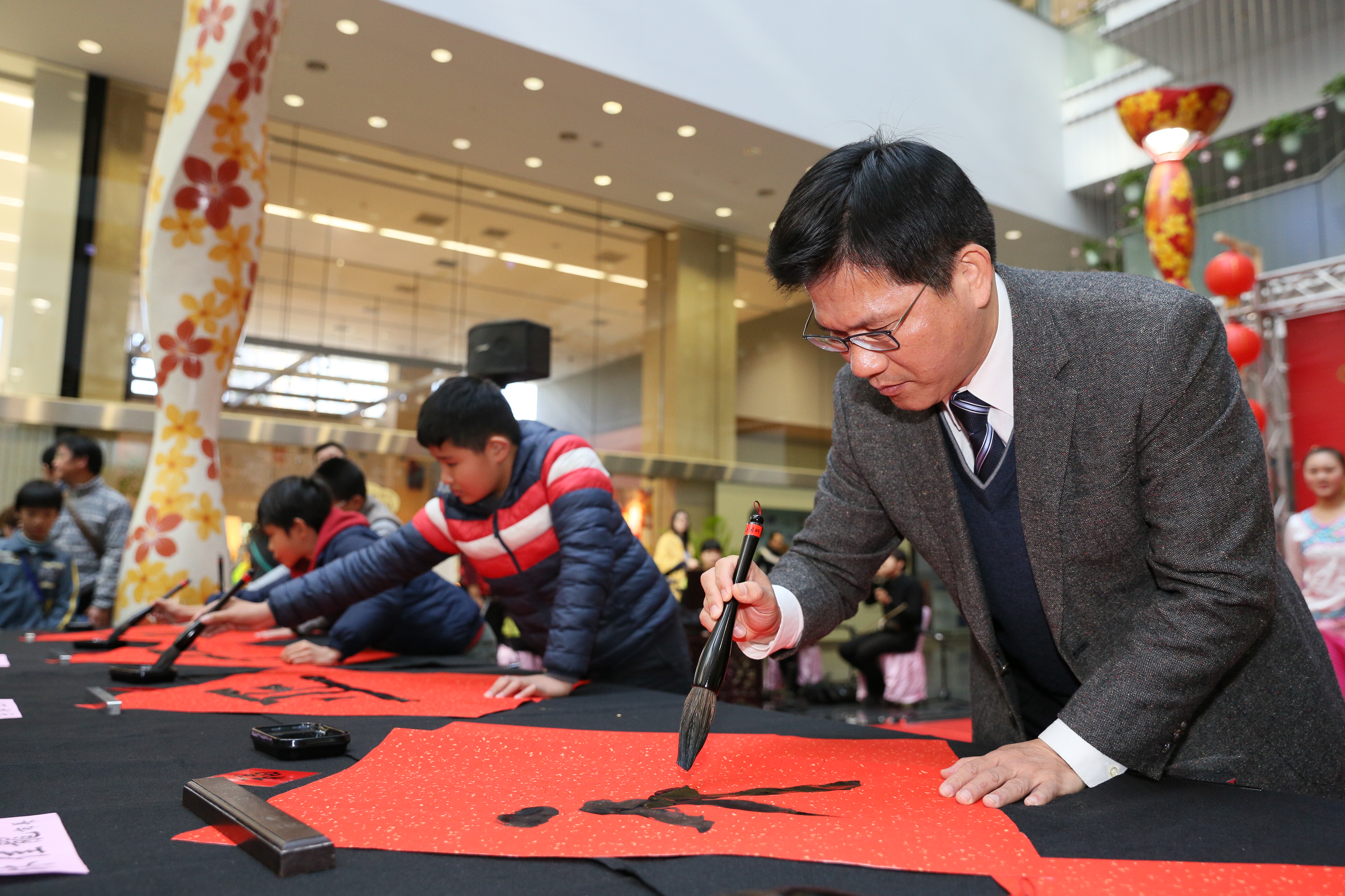 林市長與榮獲104年大墩盃書法比賽得名及才藝班推薦的7位國小同學共同寫下「迎侯晉福 滿堂春喜」;市議員們則寫下「猴喜迎春」、「猴納百福」。林市長也發送小紅包,接到紅包的小朋友都非常開心,臉上充滿笑容,農曆年雖還未到,但現場已可提前感受濃濃年節氣氛。