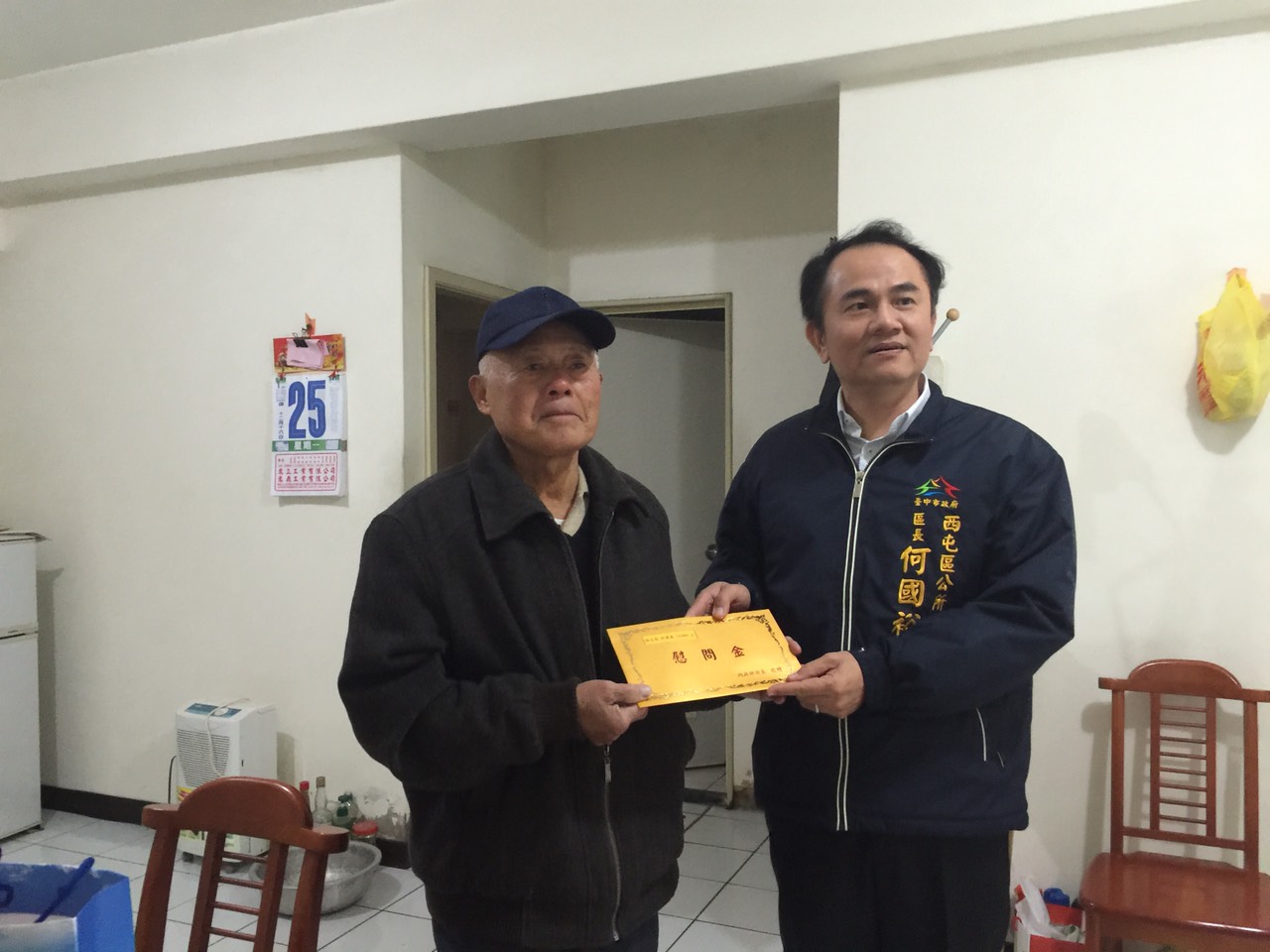 西屯區公所表示,公所不定期前往訪視及慰問這些因公受傷的退役人員,並於春節、中秋、端午等三大節日發放慰問金,以瞭解當事人及家屬的需求,適時提供相關的照護與協助。目前安排替代役人力投入公益服務,提供全癱或半癱人員生活照顧申請,讓家屬有喘息的時間,也能感受到社會的溫暖,而役男在社會服務過程中,也能發揮愛心並培養同理心與使命感。(1/28*14)*民政局