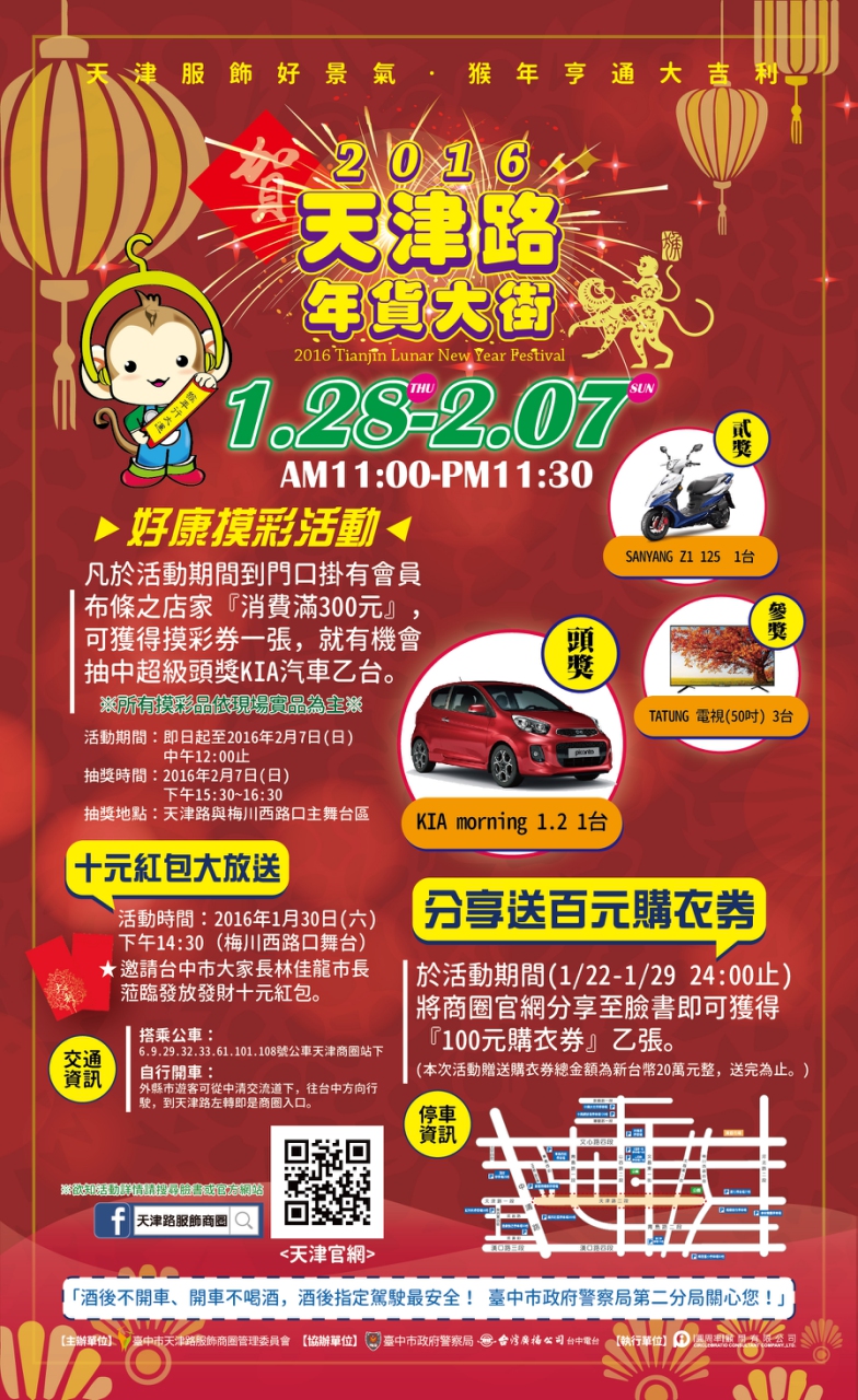 今年主辦單位也大放送,活動期間只要您在天津路服飾商圈會員店(門口有掛活動布條)消費滿300元,就可兌換摸彩券1張,滿600元可兌換2張,消費越多換越多,大獎將在2月7日下午3時30分抽出好禮送給大家。詳細活動資訊請上https://www.facebook.com/Tianjinboy/timeline或 http://www.tjco.tw/ 查詢。