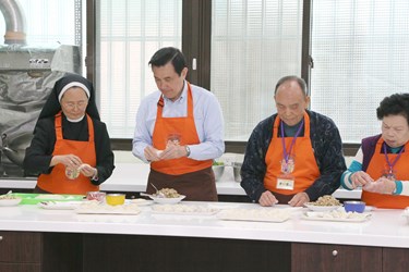 農曆春節前夕,潘副市長、市府社會局副局長陳仲良、財團法人天主教曉明社會福利基金會創辦人朱南子修女、執行長黃淑貞修女陪同馬總統、總統府副秘書長熊光華、衛生福利部社會及家庭署長簡慧娟等人,一同前往台中市西大墩社區老人照顧服務中心,一起做毛巾操並親手包水餃,體驗日照中心為長輩們精心策劃與安排的各項活動,氣氛熱鬧溫馨。