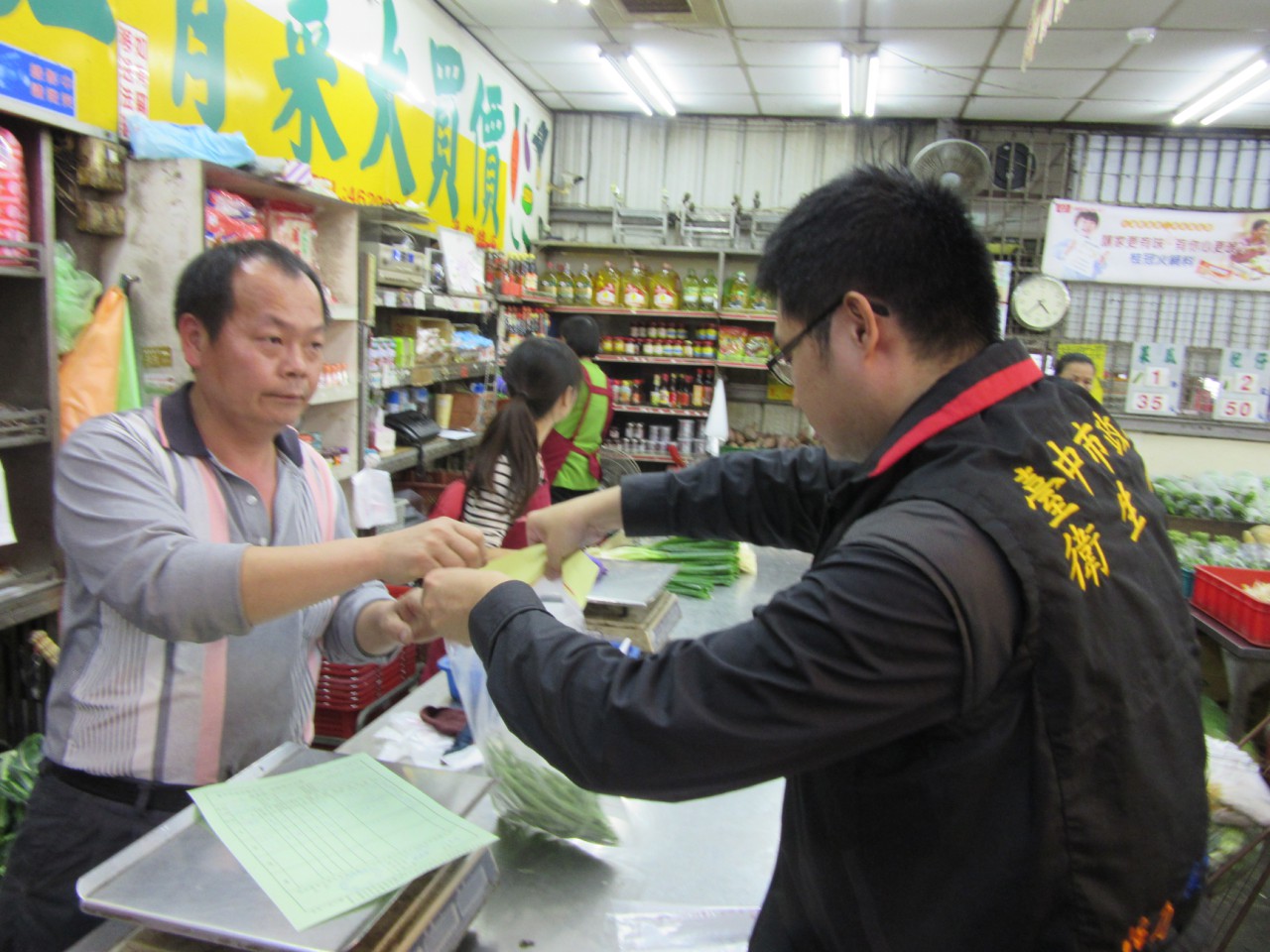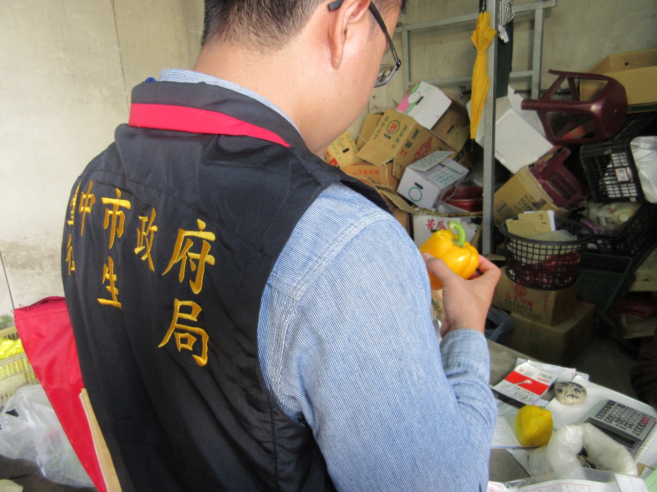 另外,在豐原區福品香肉舖抽驗「香腸」檢出亞硝酸鹽0.098g/kg[標準:0.07g/kg以下,該香腸是由台中市黃姓業者製作約10公斤全數賣給福品香肉舖,已無庫存,衛生局將請該黃姓製售商說明後,依違反食安法第18條處予行政罰鍰; 衛生局也在東區美珠菜攤抽驗「荷蘭豆」檢出芬普尼(Fipronil)0.033ppm(標準:0.001ppm以下)及在東區大輪農產品有限公司抽驗「彩椒」檢出賓客隆(Pencycuron)0.07ppm(標準:0.01ppm以下),這兩件蔬菜農藥殘留超量,根據業者說明來源為向不同供應商購入後,置放於同一區販售給散客且無庫存,衛生局將再約談販售業者釐清供貨來源以利後續處理。