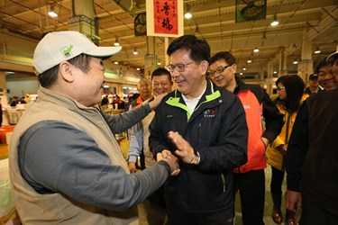 林市長隨後也與台中果菜運銷公司董事長翁添滿,前往果菜批發市場。攤販們紛紛拿出蜜棗、虎頭柑、鳳梨等與市長合影,祝福市長「好運旺旺來」,更現切洋香瓜請林市長品嘗,林市長吃了大讚「真的很香甜」;還有攤販拿出林市長5年前競選立委時的文宣名片,開心與市長拍照。