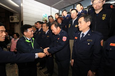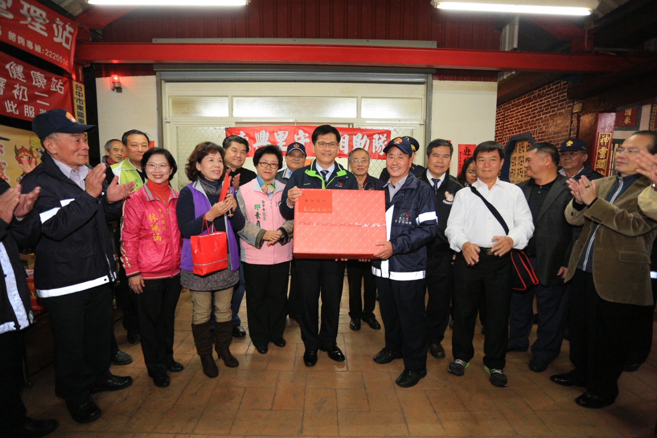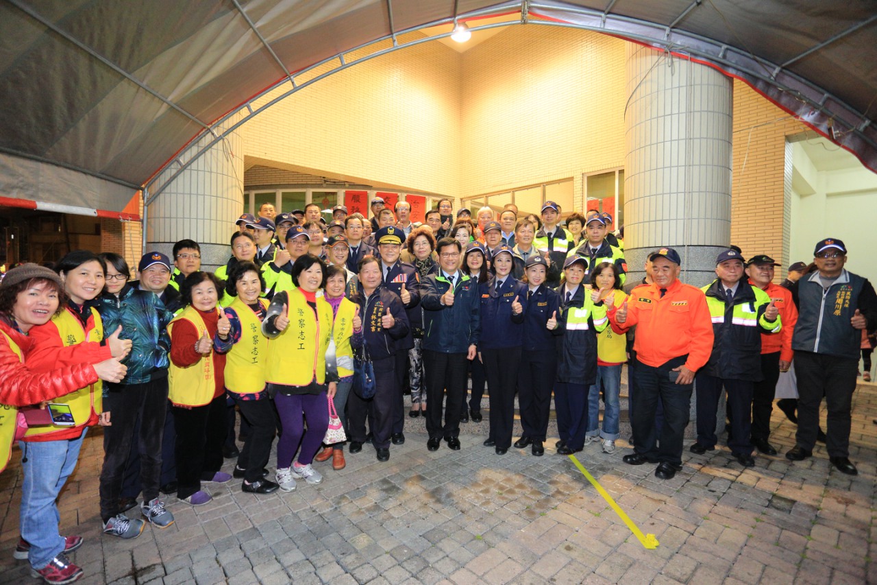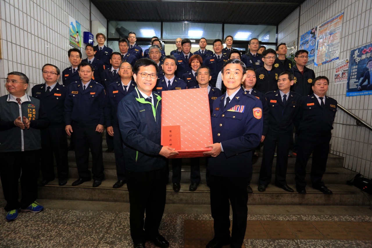 春安工作從2月1日啟動至15日共15天,台中市政府為感念春安工作期間第一線執勤弟兄的辛勤付出,今(4)晚由市長林佳龍率領多位主管分組前往警察局所屬各分局暨派出所、台中憲兵隊、東興里守望相助隊等處,共計45個單位,慰勉憲、警、協勤民力之工作辛勞。