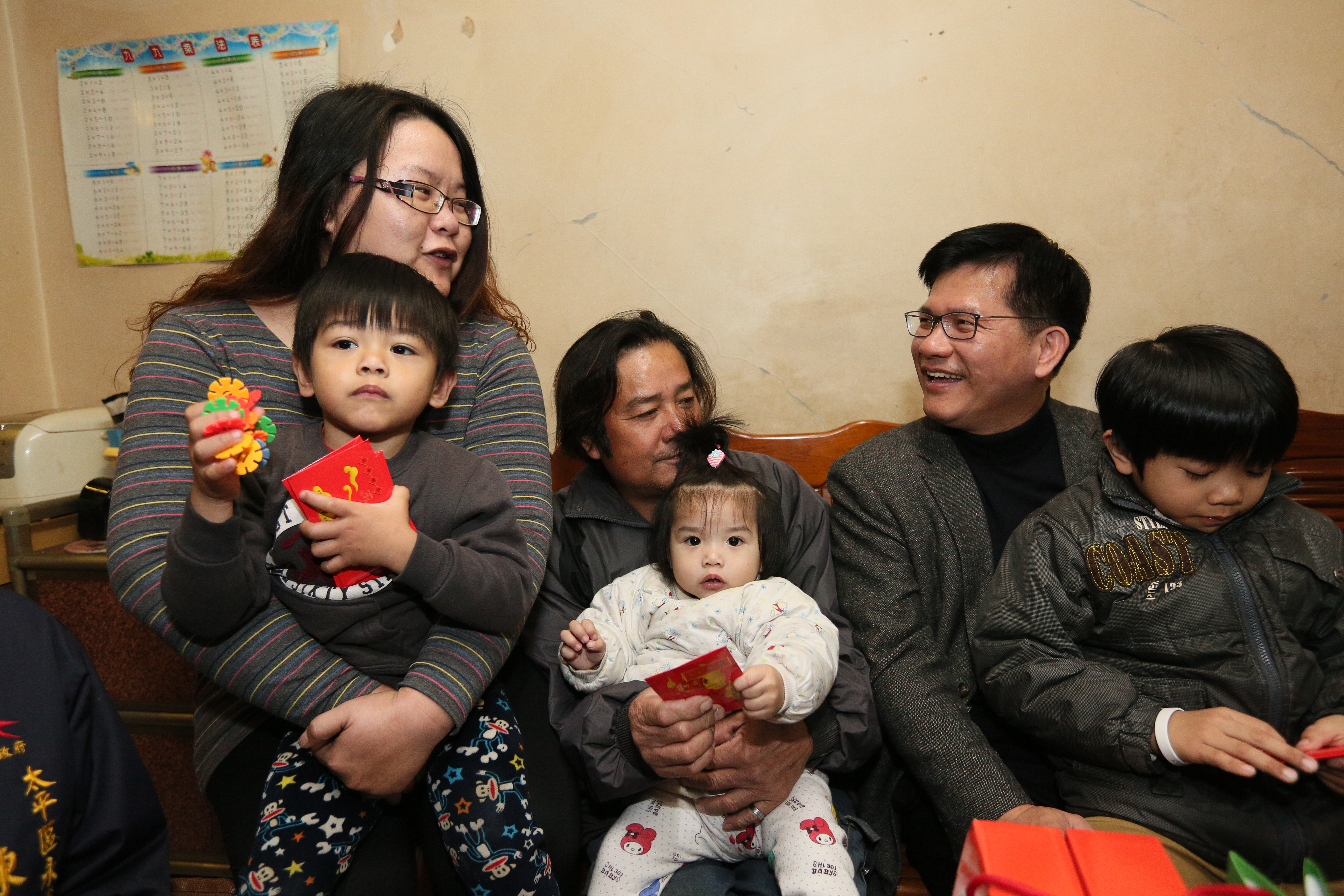 林市長此次關懷訪視的蔡家育有4子1女,年最長的哥哥只有國小五年級,最小的弟弟妹妹只有4歲、1歲,在去年7月「托育一條龍」政策推行後,兩個未滿6歲的幼兒可加額領到弱勢家庭育兒津貼每人每月最高5000元的補助,減輕些許經濟壓力。