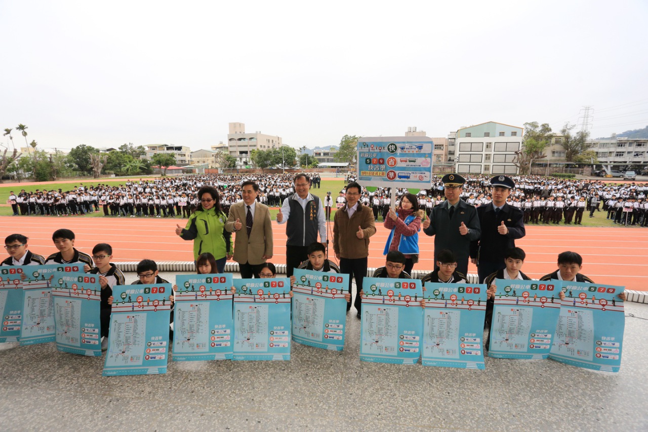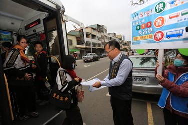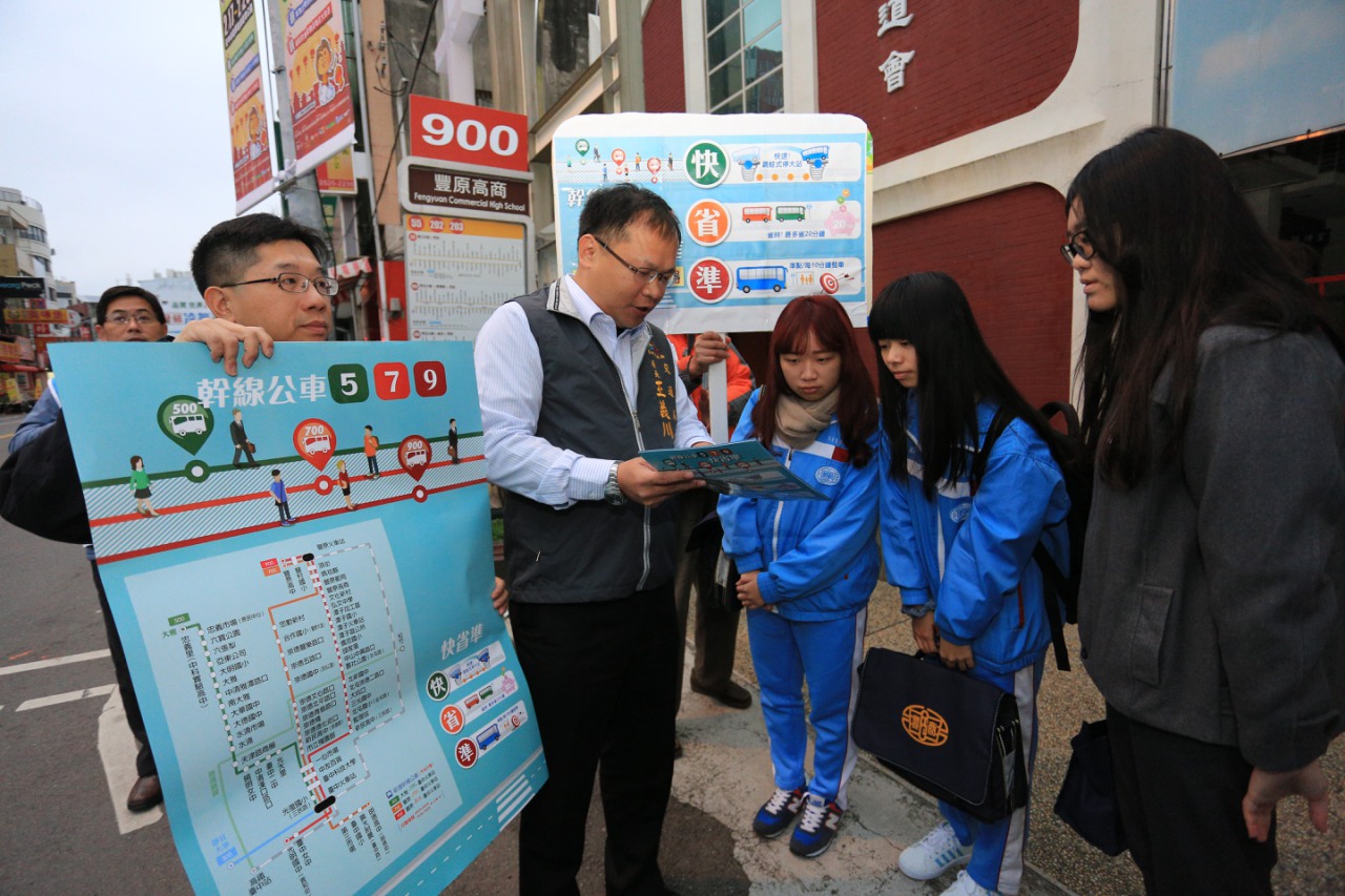 交通局長王局長今早上前往豐原高商及豐原高中,在兩校站牌前向往來學生們發放即將於3月1日上路的500、700、900號幹線公車宣導傳單,並藉由豐原高中朝會時間,向同學說明這3條新闢路線的行駛路線與特色;市議員陳清龍、翁美春也到場關心。