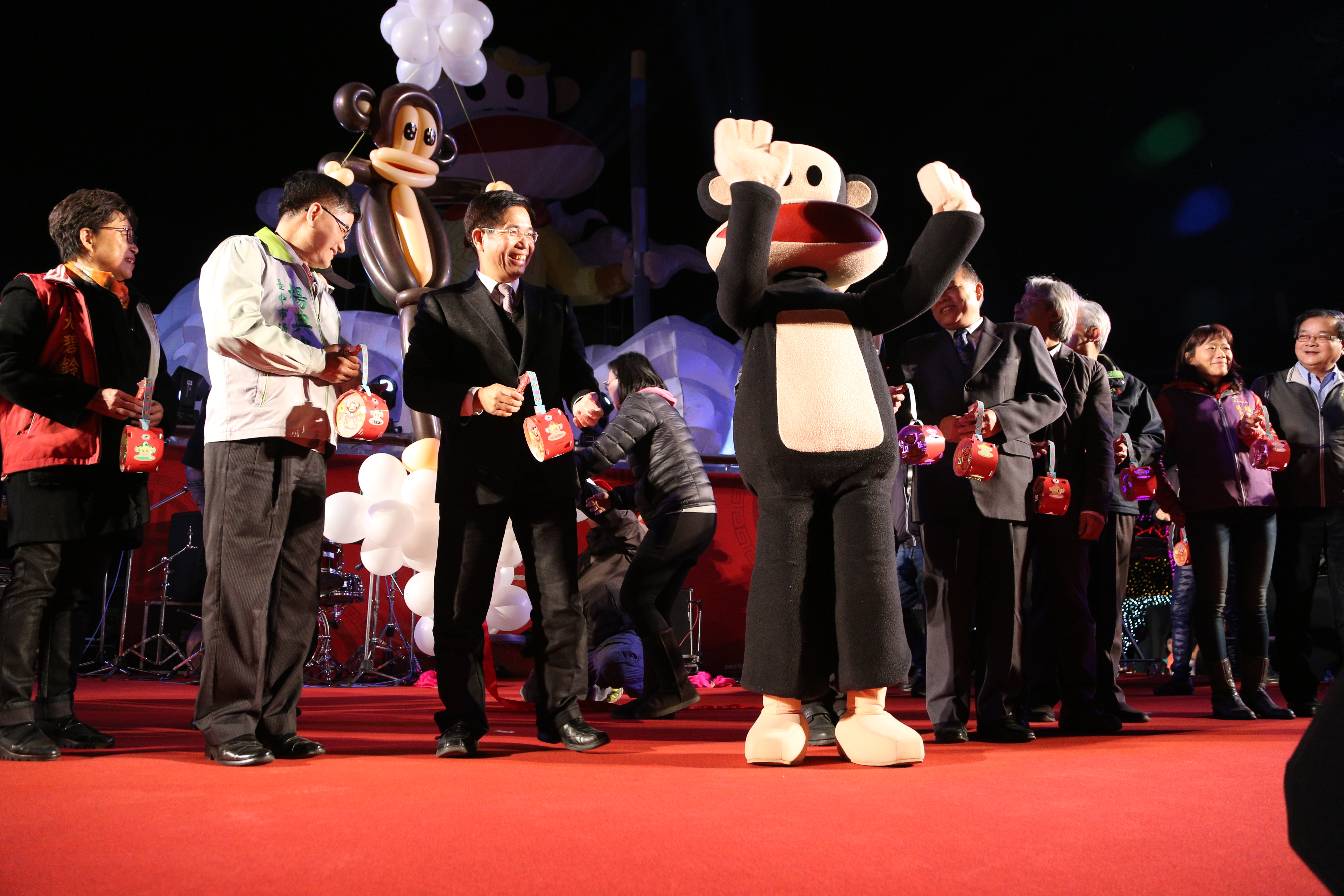 台中副市長潘文忠今晚8時在觀光旅遊局長陳盛山、文化局長王志誠、民政局長蔡世寅的陪同下,主持清水港區藝術中心燈區點燈儀式,啟動主燈「鴻福齊天‧清水大盛」大嘴猴,象徵「坐鎮清水‧鎮威八方」。市議員王立任、楊典忠、尤碧鈴、顏莉敏,也到場共襄盛舉。