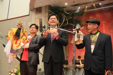 活動在台中港絲竹樂團悠揚的樂音中展開,由中華方圓茶文化學會的司茶人,為在座貴賓奉茶,並由聲五洲掌中劇團以充滿創意的橋段向大家拜年。隨後,由財神戲偶陪同林市長與文化局團隊逐桌向藝文界人士賀年,相較往年的新春團拜多了一絲趣味,並增加了市長與台中市藝術家的互動機會,期待藉由新春團拜活動,凝聚藝文共識,讓大台中的藝文發展也能「創意滾滾 猴力旺旺」。