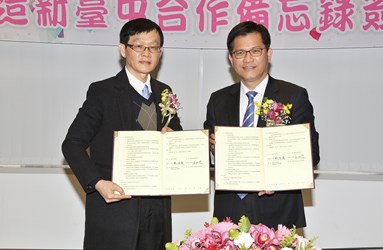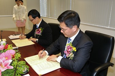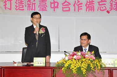 台中市長林佳龍今日在副市長潘文忠及教育局長彭富源的陪同下,出席市府與國立台中教育大學合作備忘錄簽約儀式,台中教育大學則由校長王如哲一行人代表與會,雙方簽署並互贈紀念品,象徵合作展開。