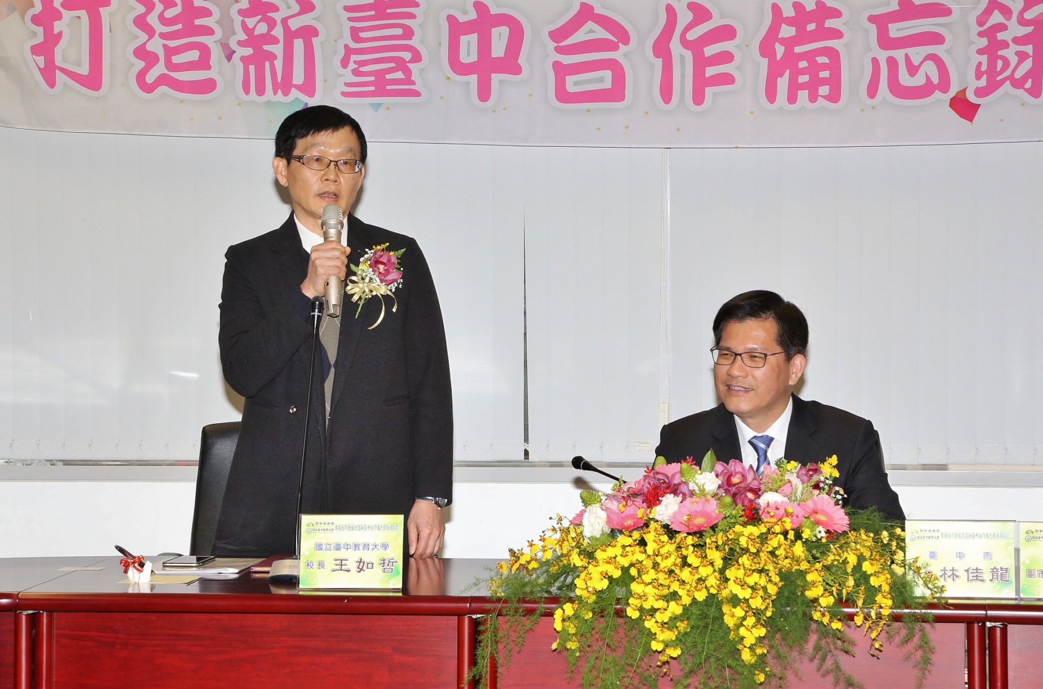 國立台中教育大學校長王如哲表示,今日的簽署有三好,「好緣分、好默契、好規畫」。早年林市長與他曾在中正大學教書,現在於市府相見歡,相當有緣;過去潘副市長與他曾在國家教育研究院共事,相信彼此有一定的默契;而台中教育大學正朝向大學城發展,並已籌畫一年,市府也積極推動文化城中城計畫,兩者相搭配,相信對台中市區的城市發展有相當助益。