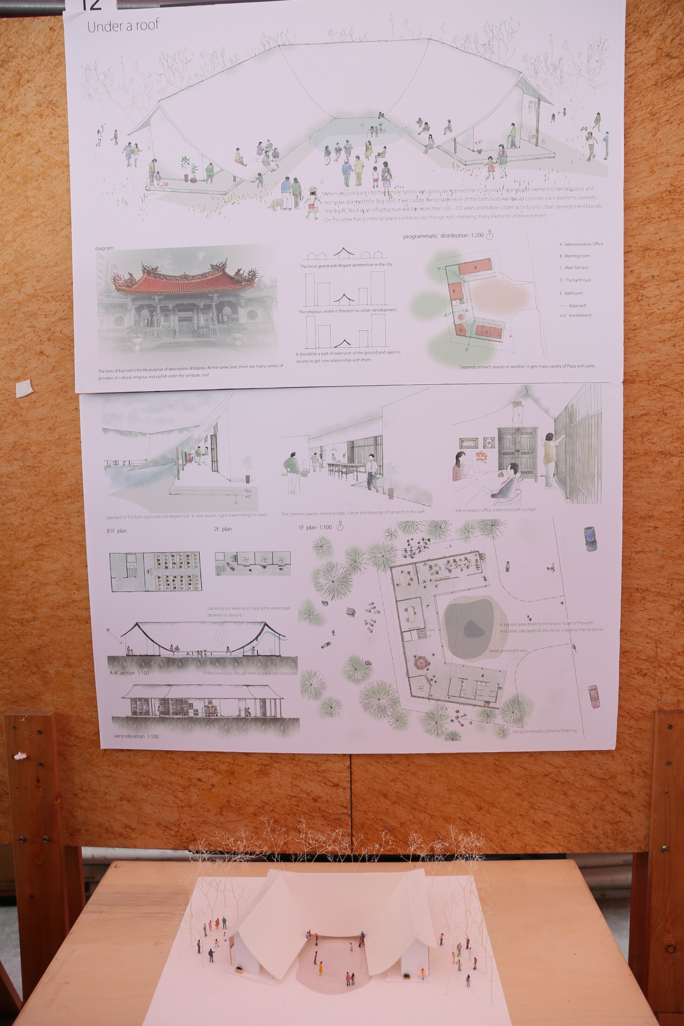 與日本大阪市立大學學生芥隆之介配合設計的建築師黃志瑞表示,「Under a Roof」設計為「ㄇ」字型,開口面向馬路象徵包容與開放,建物保留並加大傳統宮廟的屋頂,讓屋頂從天到地的垂降與大地融合,在傳統的外表下,建物內部的設計則可充滿變化,象徵建物這項容器,可以隨著時代變化。
