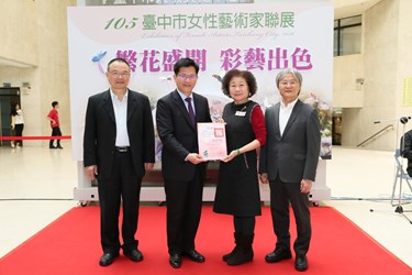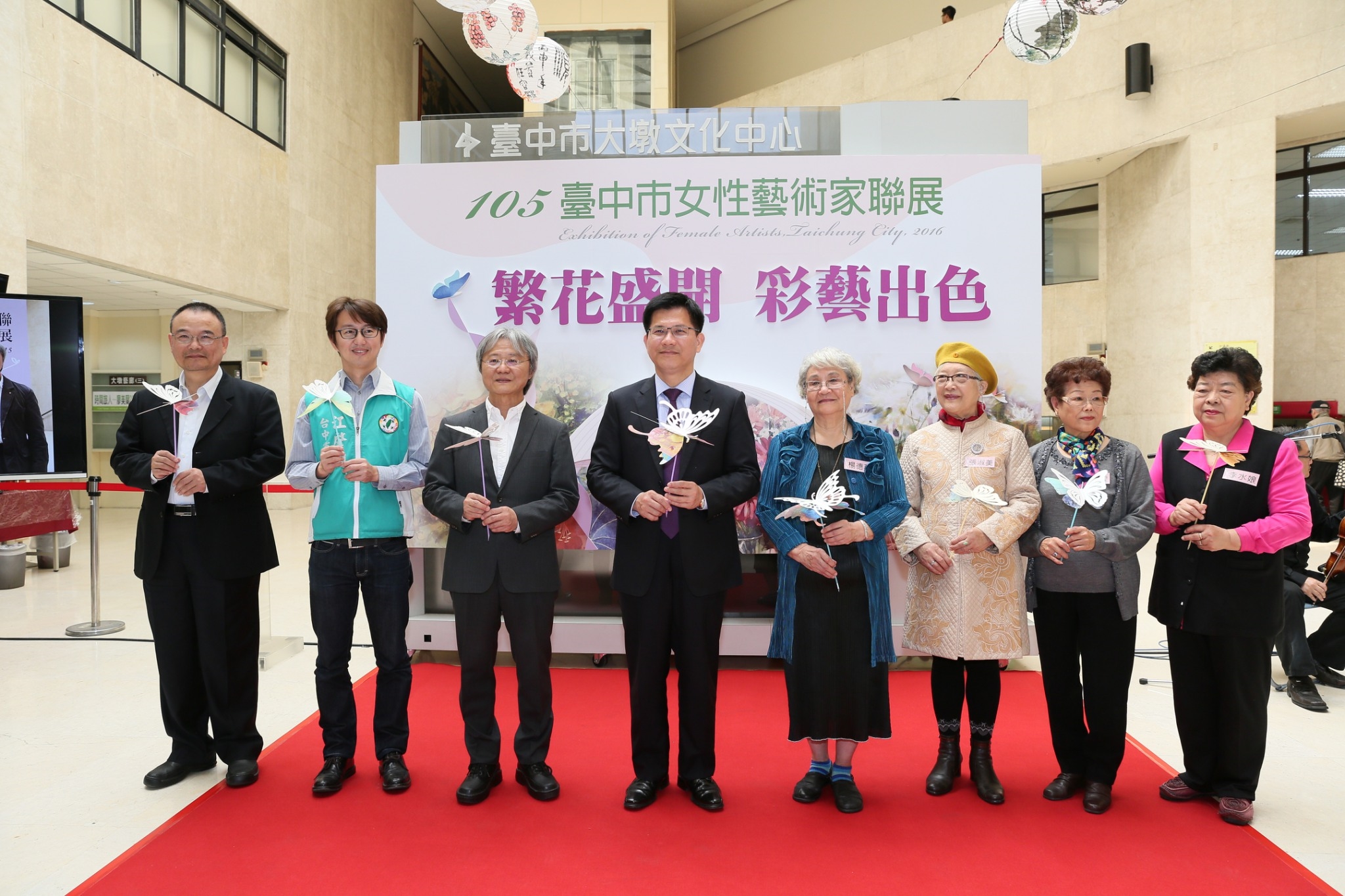邁入第12年的女性藝術家聯展今日開展並舉行開幕典禮,由市長林佳龍、立法委員黃國書、市議員江肇國、文化局長王志誠、國立台灣美術館館長蕭宗煌,與資深女性藝術家張碧瑝、張淑美、楊德英、李水娘等人,一同將飛舞的立體蝴蝶點綴在花海背板上,代表活動正式開始;林市長也頒發感謝狀給參展的藝術家。