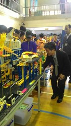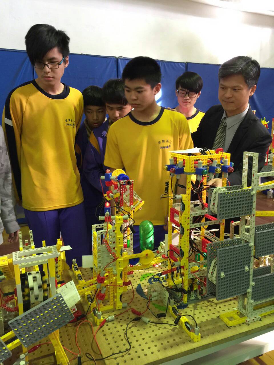 彭局長也與現場學生團隊互動,以了解關卡設計與作品組合思維。他表示,很高興學生們很有自信地說明作品設計的邏輯思維過程,並大方地展示通過層層關卡的動線流程,也將「GreenMech」強調綠色能源使用及永續發展的精神自然地融入於關卡設計組合中。