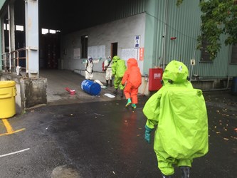 今日模擬災害為桶裝化學原料二氯甲烷溢漏、消防人員到場處置的應變措施。根據緊急應變指南,二氯甲烷中毒可能造成頭暈、噁心、嘔吐、精神混亂等症狀,消防員需穿戴A級防護衣避免暴露,並灑水將二氯甲烷稀釋至安全濃度50ppm以下。