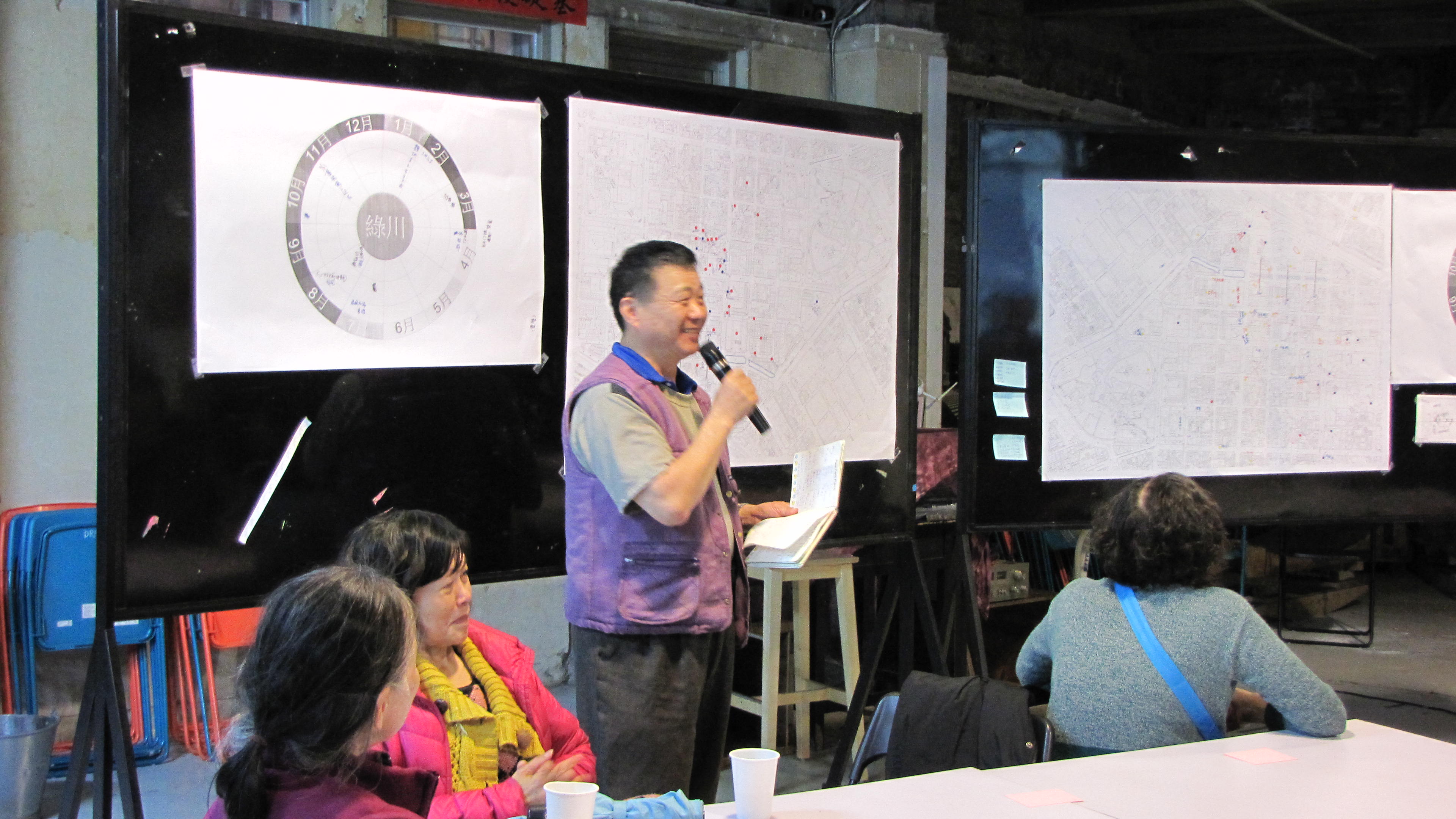 大家的話題從綠川的水從哪來,一路講到中區未來發展,串連起綠川歷史脈絡與新生活願景。此外,與會者也一起在綠川周邊都市發展圖、河道剖面圖、年曆時光鐘上,利用筆與貼紙標示出各自記憶中,綠川沿岸的日常生活脈絡,含括食、衣、住、行、育、樂等生活態樣。