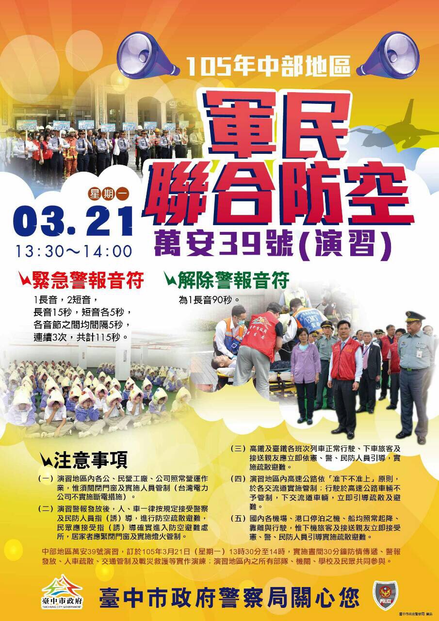 多一分準備、少一分災害!台中市105年災害防救演習及軍民聯合防空(萬安39號)演習將在3月15日及21日分別登場,台中市政府提醒,萬安39號防空警報預定21日下午1時30分至2時發放,請全市所有部隊、機關、學校及民眾,應配合疏散避難。