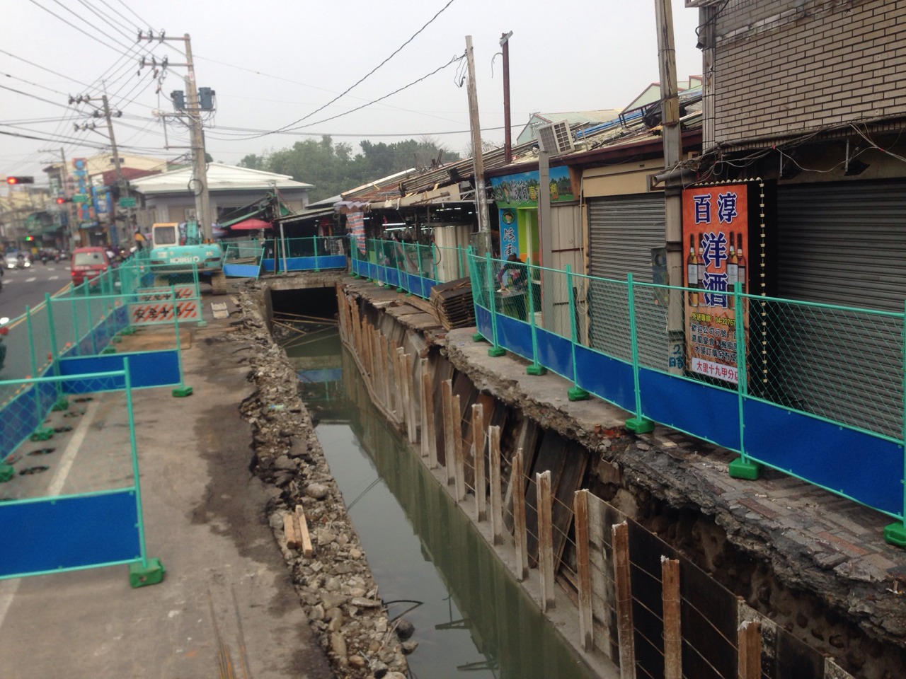水利局表示,此工程因既有水路部分位於鄰近市場下方,開挖後打設擋土鋼軌支撐土石時,為避免破壞到緊臨市場的棚架墩柱基礎,危及棚架安全,因此一開始採取較保守距離,先在既有護岸往南打設擋土鋼軌設施,待全面開蓋檢視並確認安全無虞後,再將鋼軌樁往北順修,銜接下游6公尺寬的既有箱涵。