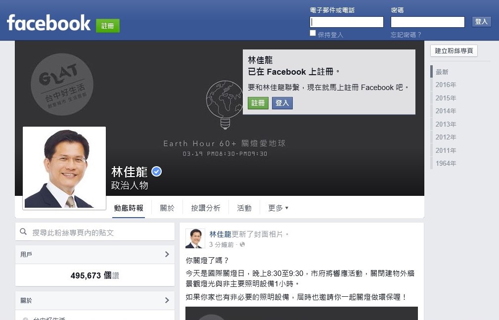 「2016 Earth Hour地球一小時」國際關燈日台灣時間今晚8時30分至9時30分登場,林市長的臉書換上了象徵關燈後黑漆漆的圖片,中間只有一顆地球造型的燈泡,標示活動響應時間,相當醒目,希望引發網友共鳴,一起響應關燈省電救地球。