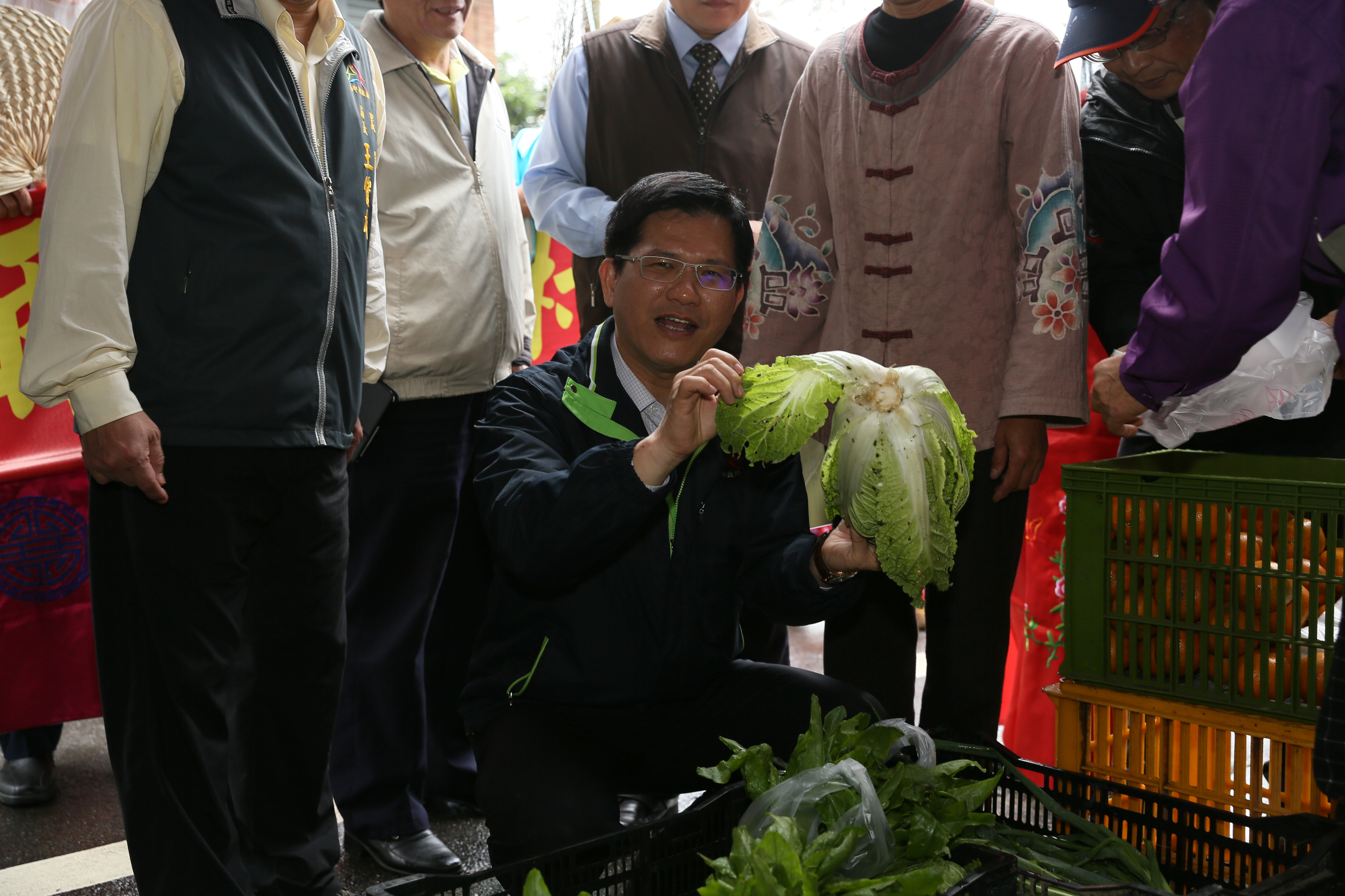 市集包括各式由農民種植的有機蔬果及農產加工品,林市長逐一到攤位慰問,受到熱烈歡迎,紛紛與林市長合照;而他也一連買了小白菜、蔥、枇杷、番茄、桂花酸梅湯等各種蔬果,笑稱是「拼經濟」;他也指出蔬菜上有些許蟲咬的痕跡,表示確實是有機栽種,讚揚農民的用心。