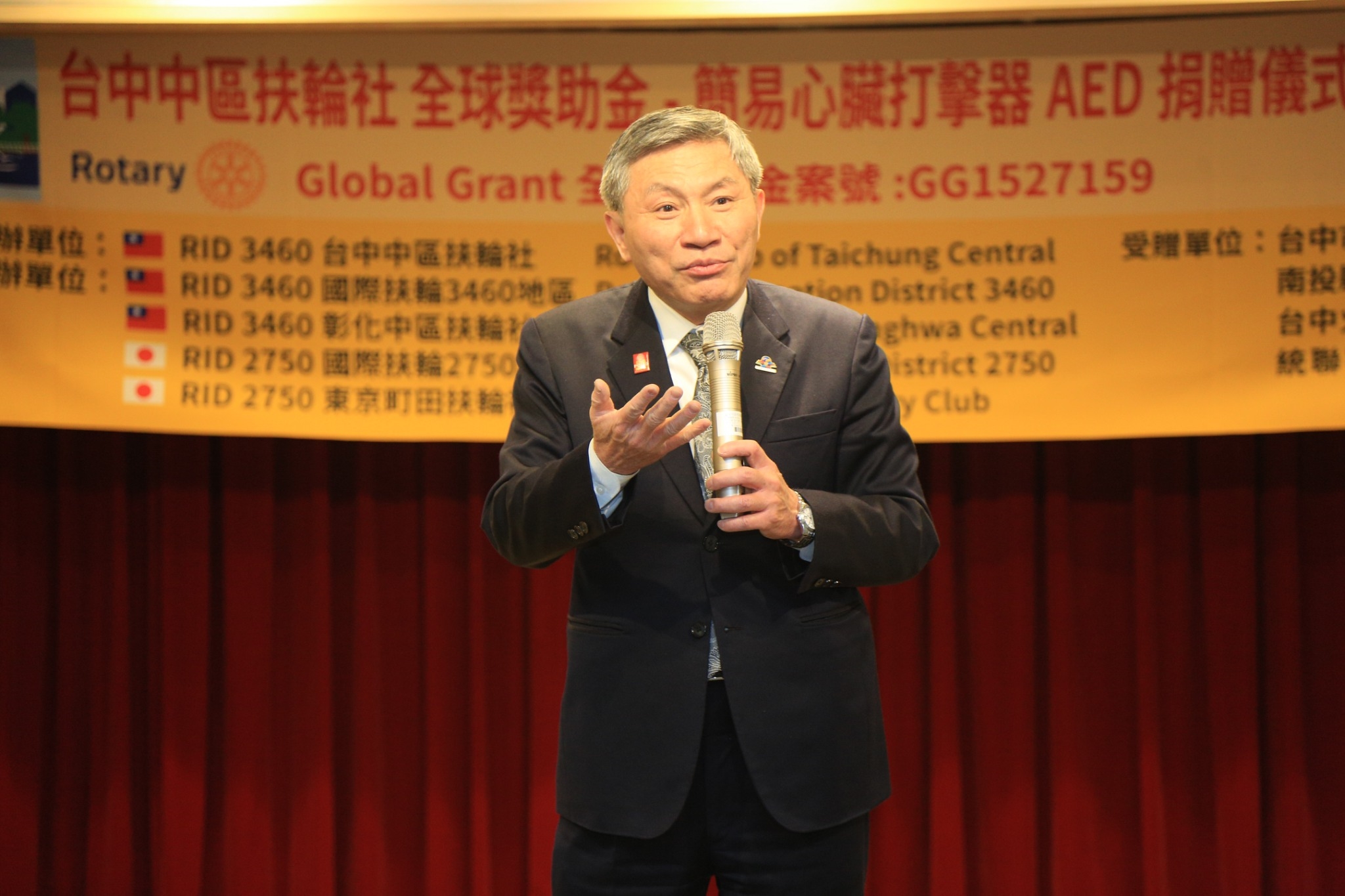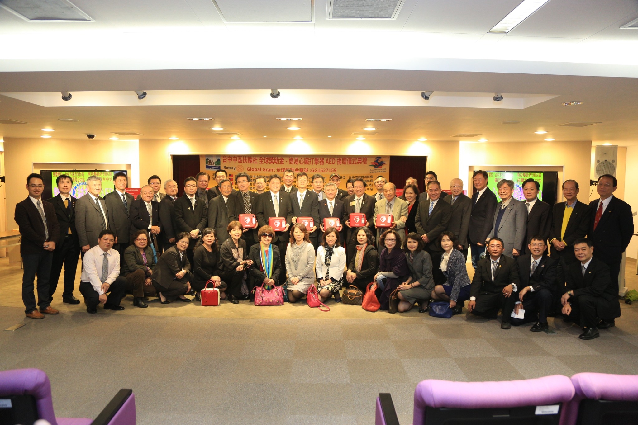 聯合捐贈儀式今日下午在台灣大道市政大樓舉行,副市長張光瑤在消防局長蕭煥章的陪同下出席受贈,並代表市長林佳龍及市民感謝國際扶輪3460地區-台中中區扶輪社的捐贈,國際扶輪社3460地區台中中區社長黃慶昇、彰化中區扶輪社社長林敬智及台鐵台中站長葉仁和等人到場,會中中興保全公司旗下的立偉電子公司也進行AED操作示範及狀況演練,希望讓與會代表更了解其功能性及重要性。