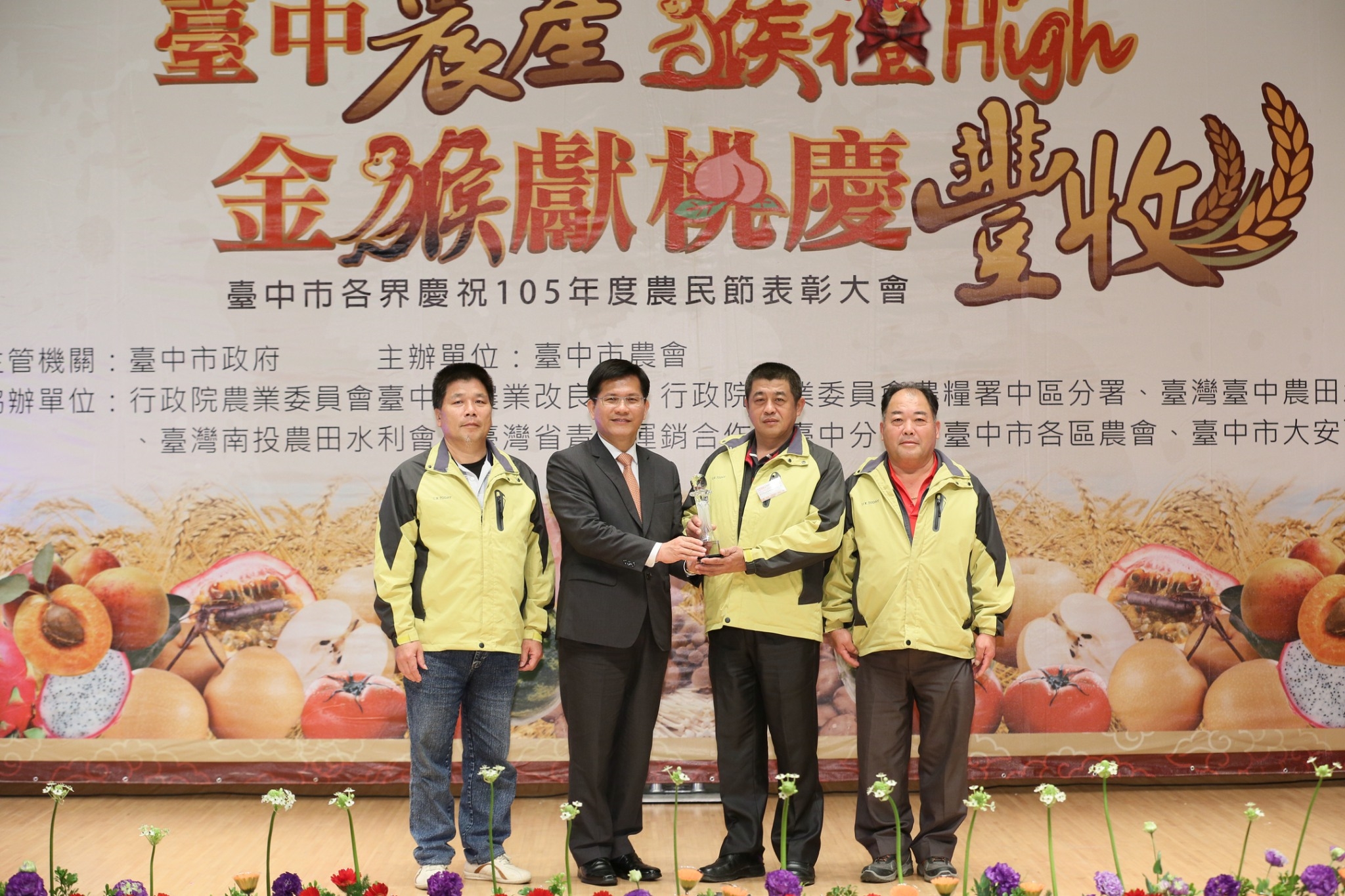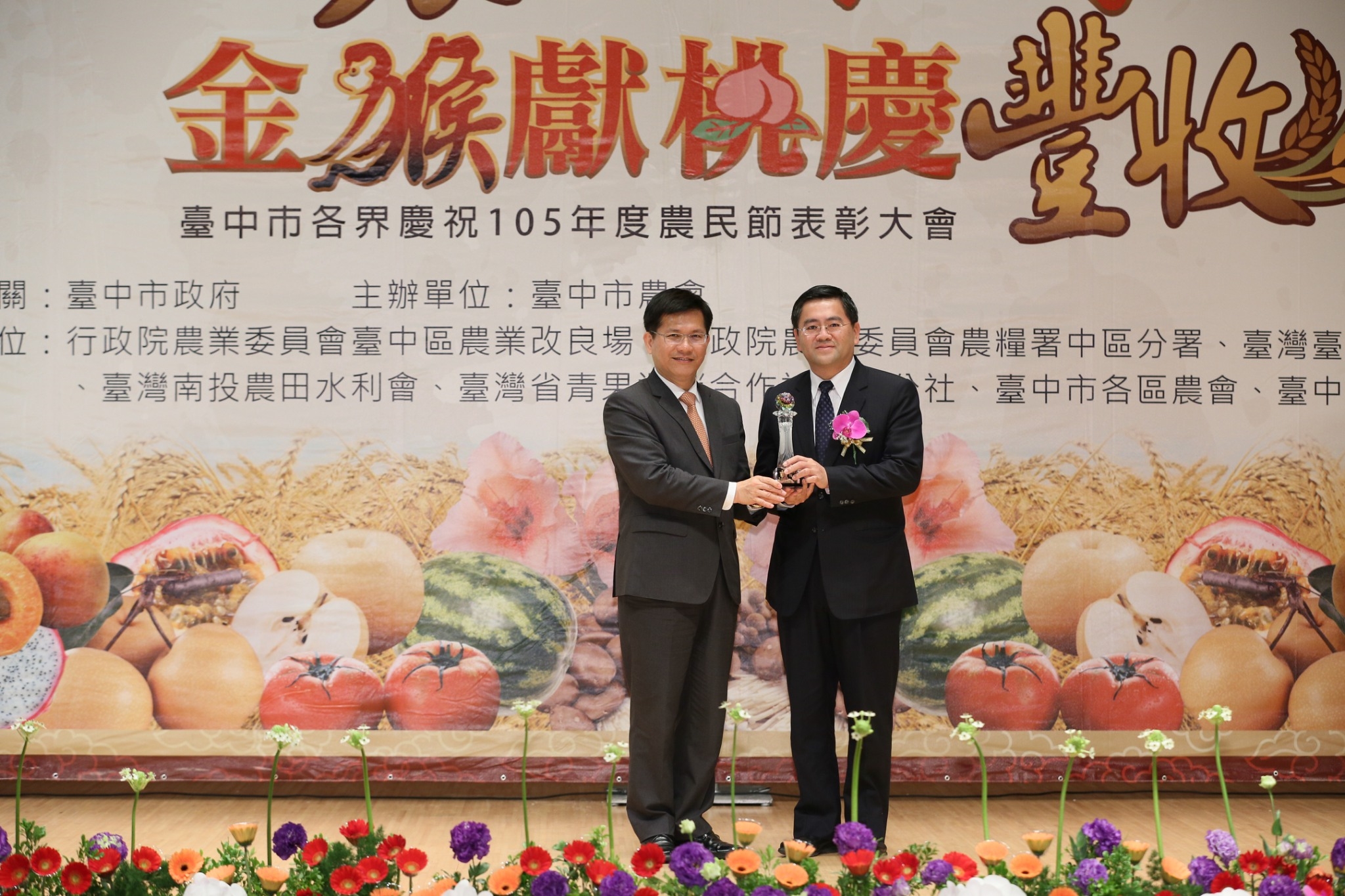 「台中市各界慶祝105年度農民節表彰大會」由台中市政府、台中市農會共同辦理,表揚台中市各界優秀農民及對農業有功人員,林市長、市議員何敏誠、劉士州及各農會總幹事代表皆出席,為農民加油打氣。