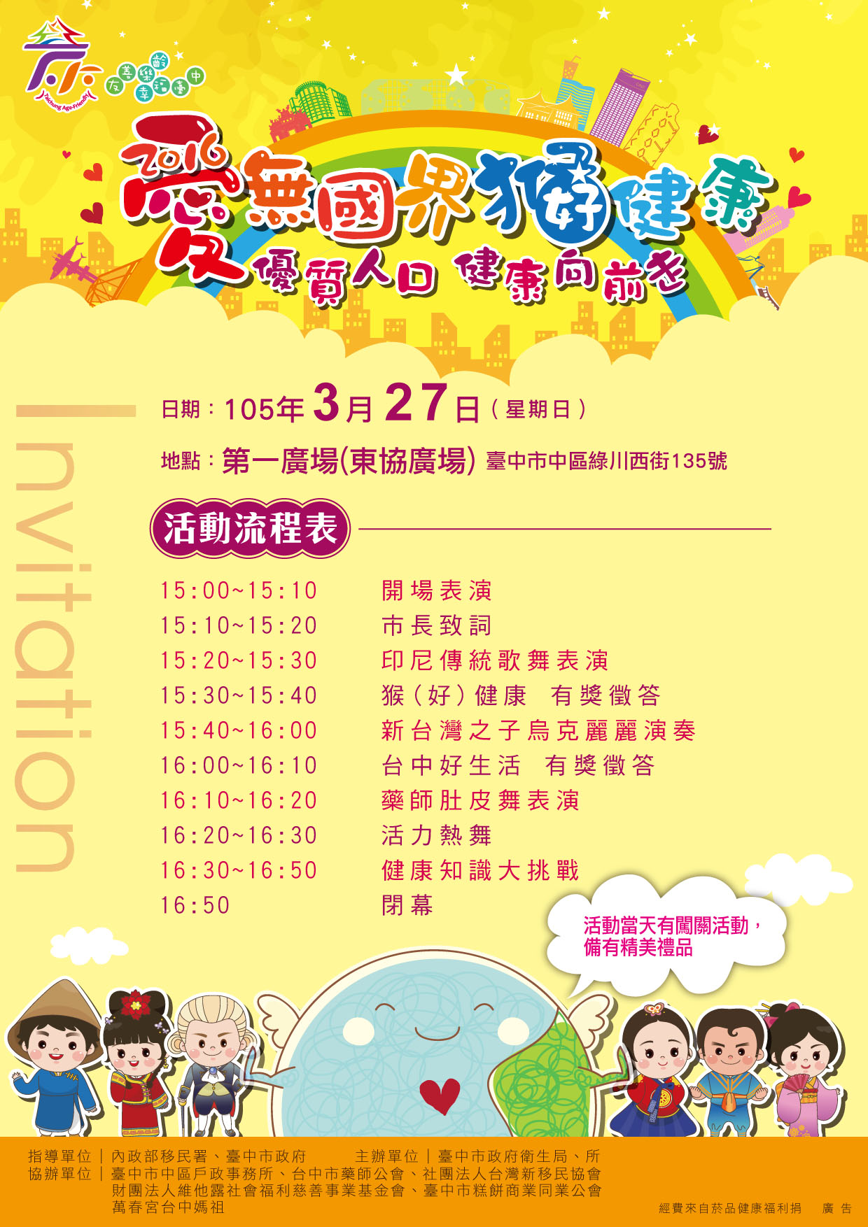 此外,週日(27日)在第一廣場(東協廣場)一樣熱鬧!「2016愛無國界,猴(好)健康」活動,邀請到新住民團體及新台灣之子帶來才藝表演,還有藥師肚皮舞與學生熱舞節目,喜歡挑戰闖關的朋友們也歡迎來挑戰有獎徵答,完成闖關遊戲不僅能獲得1份台中名餅,還有機會得到香火綿延300年的萬春宮「台中媽祖」加持的琉璃金箔項鍊。