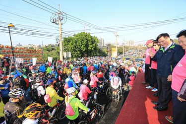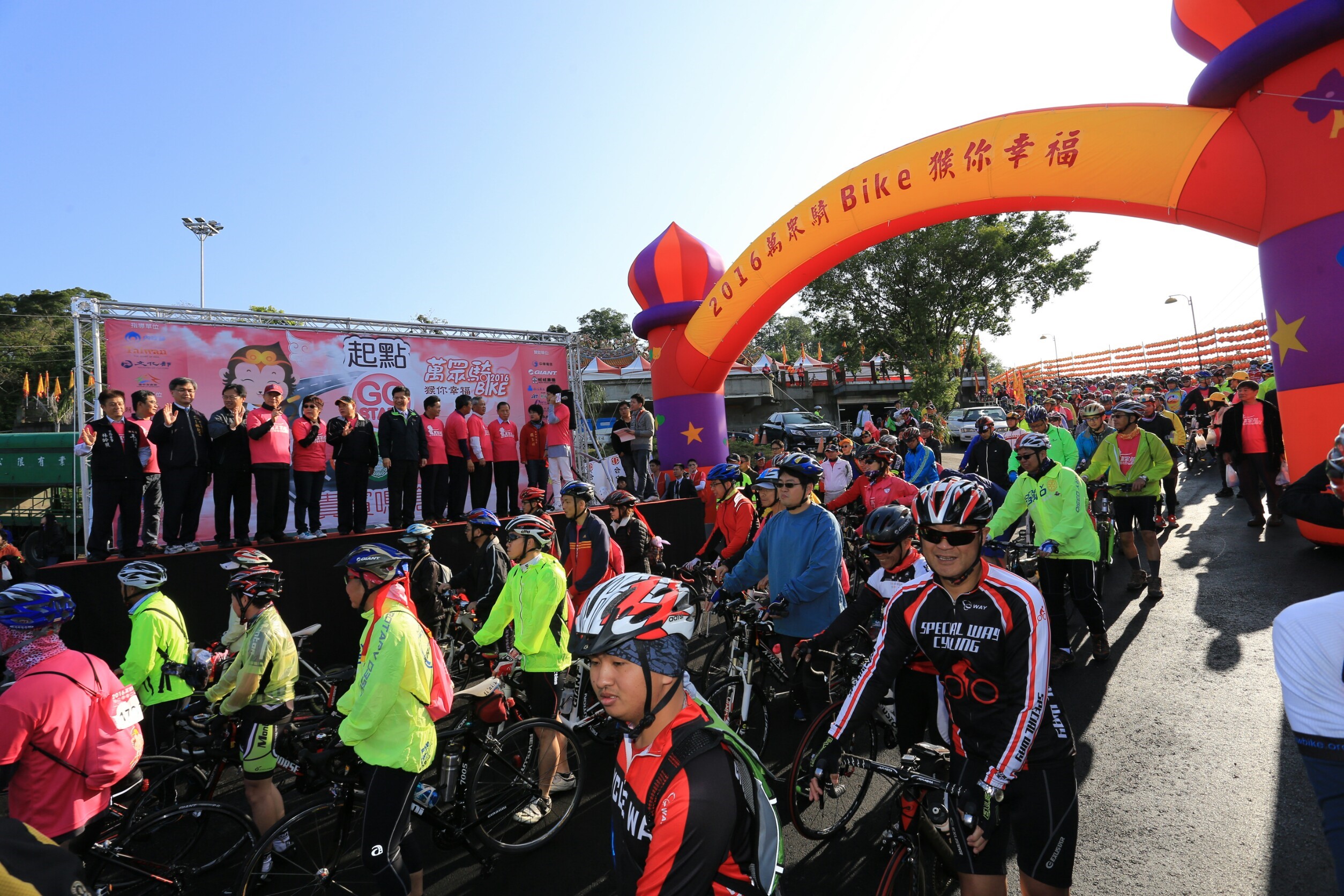 2016台中媽祖觀光文化節系列運動「萬眾騎BIKE」吸引超過萬人報名,今日清晨市長林佳龍在民政局長蔡世寅、體育處長郭明洲等人的陪同下出席,鳴笛後眾人自北屯朝聖宮浩浩蕩蕩出發,市議員張玉嬿、大甲鎮瀾宮副董鄭銘坤及多位宮廟代表也共襄盛舉。