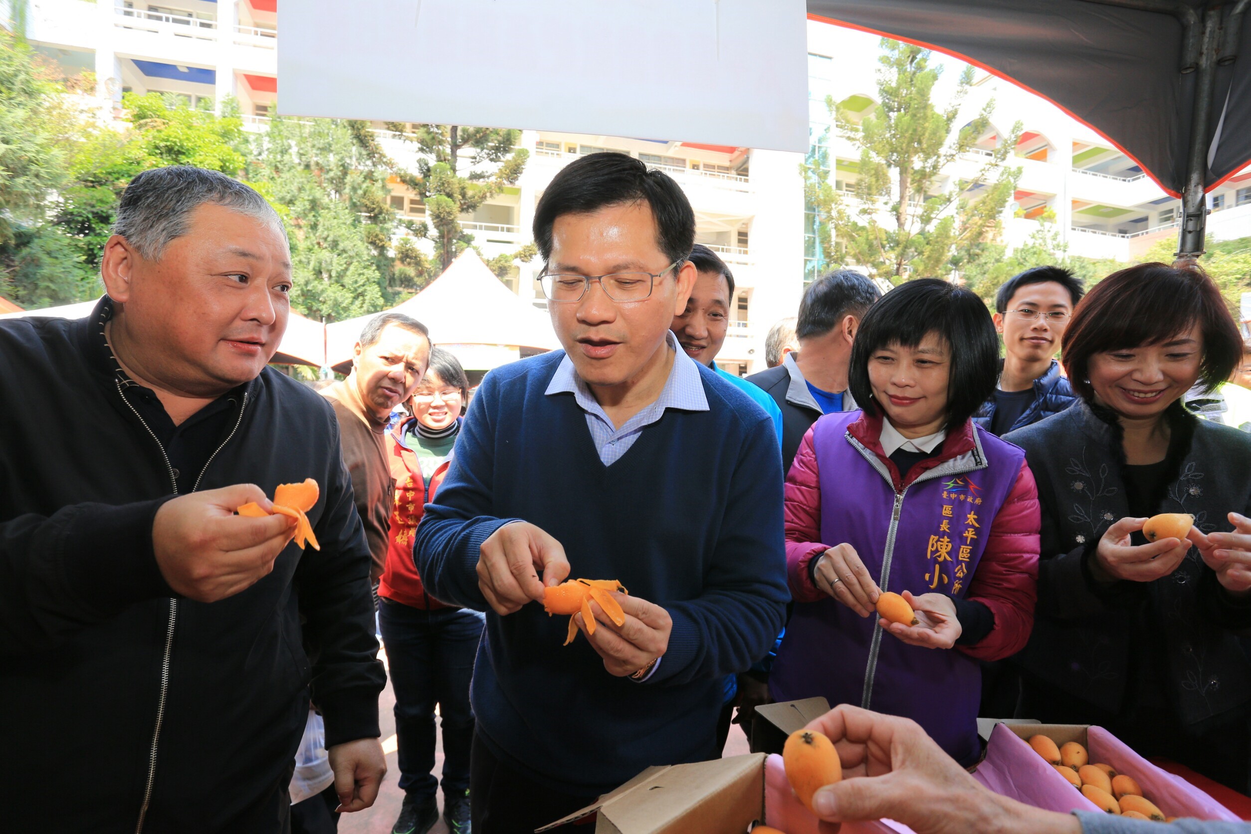 林市長笑稱上週女兒吃他帶回去的太平枇杷讚不絕口,他也到各個攤位關心及問候農民,在品嚐枇杷後盛讚「色美、味甜、多汁皮好剝!」,並與來往的民眾親近合影留念。