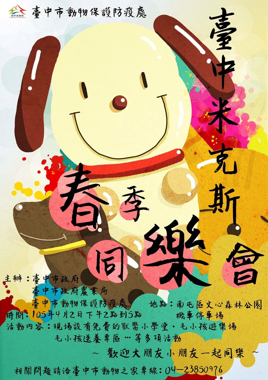 週六(2日)下午2時至5時「台中米克斯春季同樂會」將在文心森林公園盛大登場!這次活動主題以「世界流浪動物日」為起點,結合「兒童節」輕鬆且充滿活力的意象,用同樂會的形式,在歡樂的氛圍裡體驗最真實的動物保護生命教育。