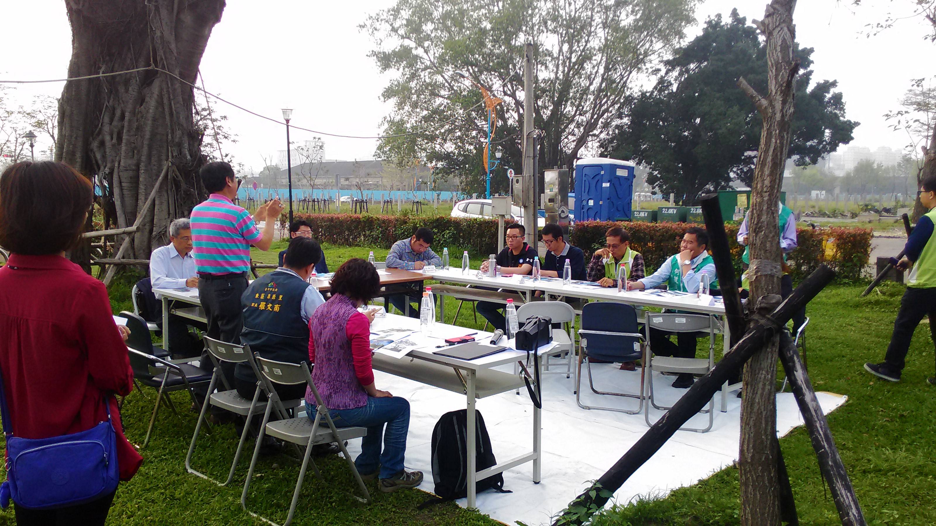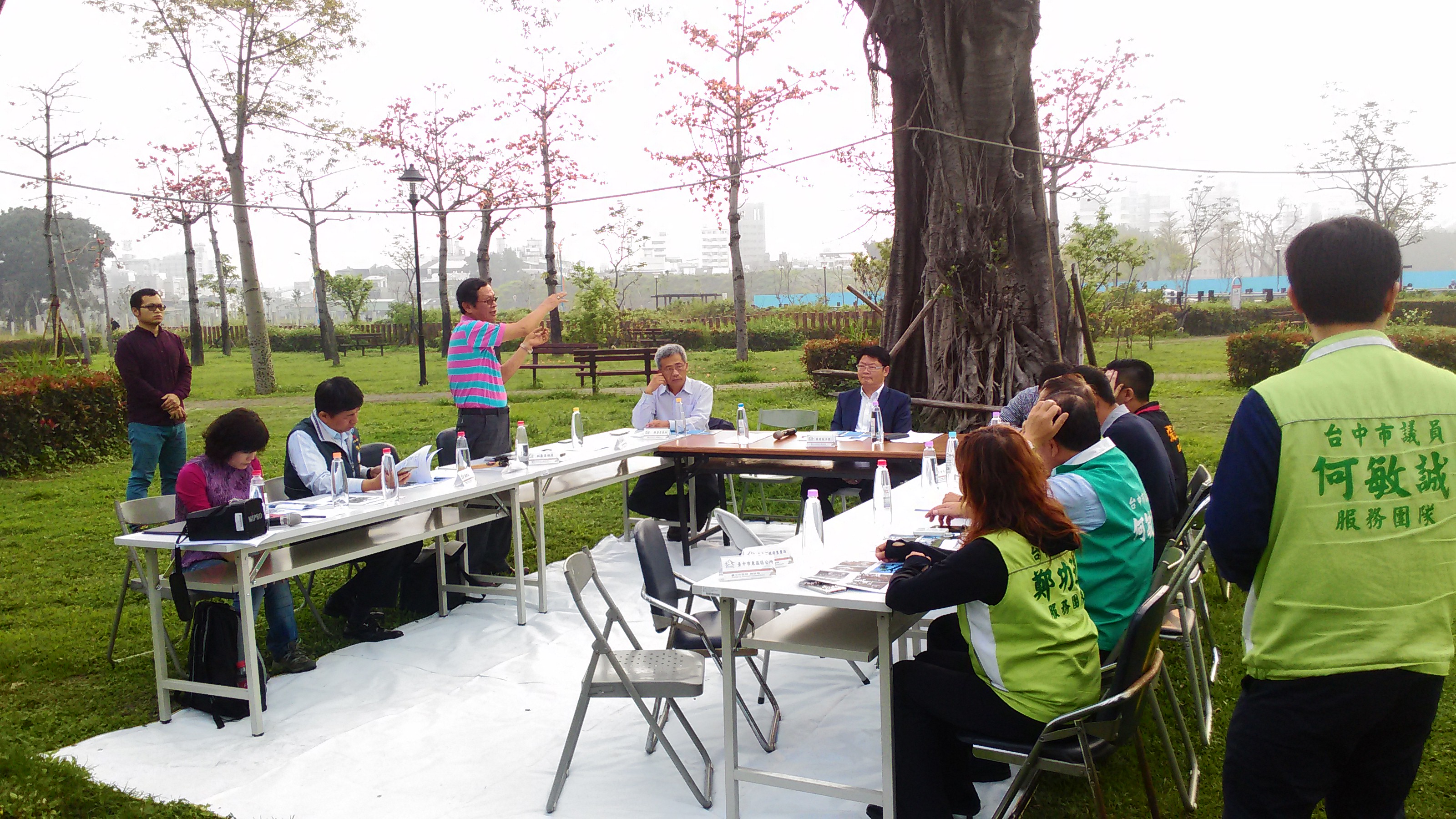 建設局長黃玉霖日前邀集市府農業局、行政院農業委員會林業試驗所傅春旭、張東柱及中興大學顏志恆等農業專家,前往東區泉源公園勘查園內老樹,進一步確認治療成果,並研商後續照護對策;市議員何敏誠也到場關心。