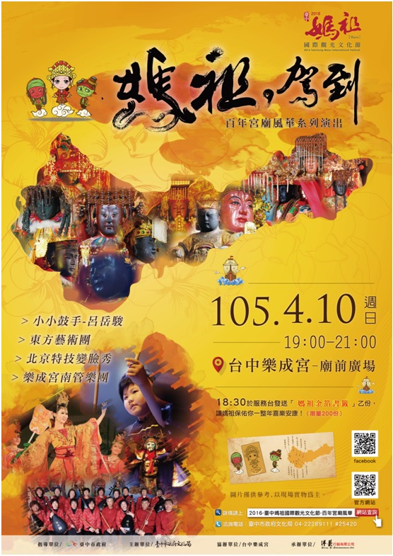 大甲媽祖將在今晚起駕,預計4月17日(星期日)回鑾安座,一連串的表演活動,也盛大展開!今晚在大甲中山路與經國路口將搭設觀禮臺,晚上6時起許多台中表演團隊輪番上陣,增添媽祖起駕的熱鬧氣氛;而10日(星期日)晚間7時,在樂成宮廟前廣場也有表演團隊匯演,邀請到泰國皇家歌舞團及台中市視障小鼓手呂岳駿小朋友、台南府城優秀表演團隊-東方藝術團、北京特技變臉秀及樂成宮南管樂團,帶來精緻演出,更讓大家享受高品質的藝文饗宴!活動專網請見http://bit.ly/22UbjN1http://bit.ly/1V0GPou