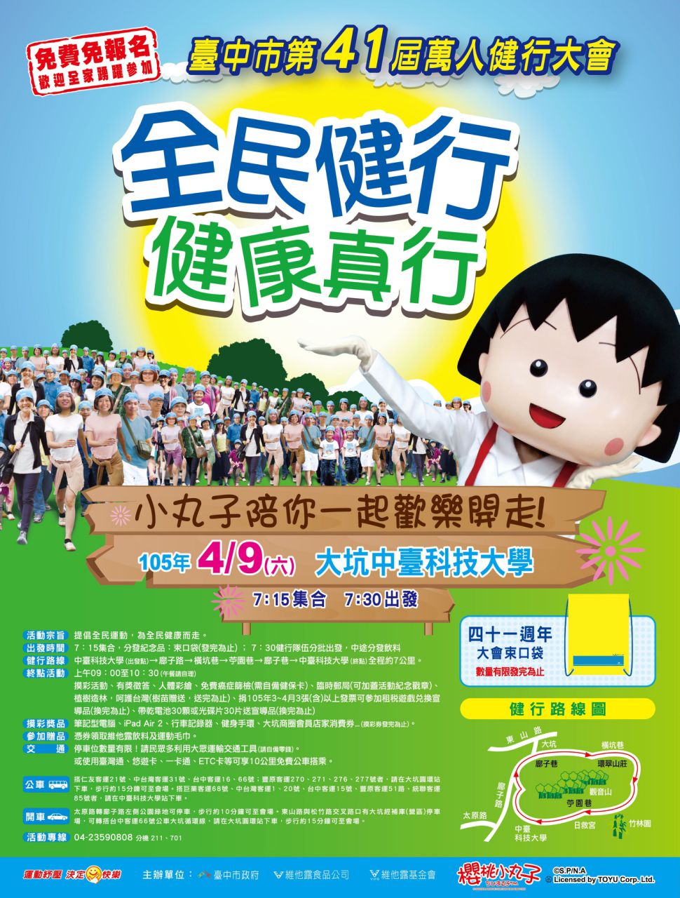 一年一度的萬人健行大會,將於9日(星期六)在大坑風景區登場!這次大會特別邀請到全家大小都喜愛的櫻桃小丸子和爺爺到場與大家齊步走,現場還有豐富的表演活動,以及好康大摸彩,包括筆記型電腦、iPad Air 2、行車紀錄器、健身手環、大坑商圈會員店家消費券等豐富大獎,等您抱回家!此外,還有限量的41週年大會運動背袋,要送您收藏紀念,數量有限,請儘早到場索取!活動專頁請見http://bit.ly/20csKDr