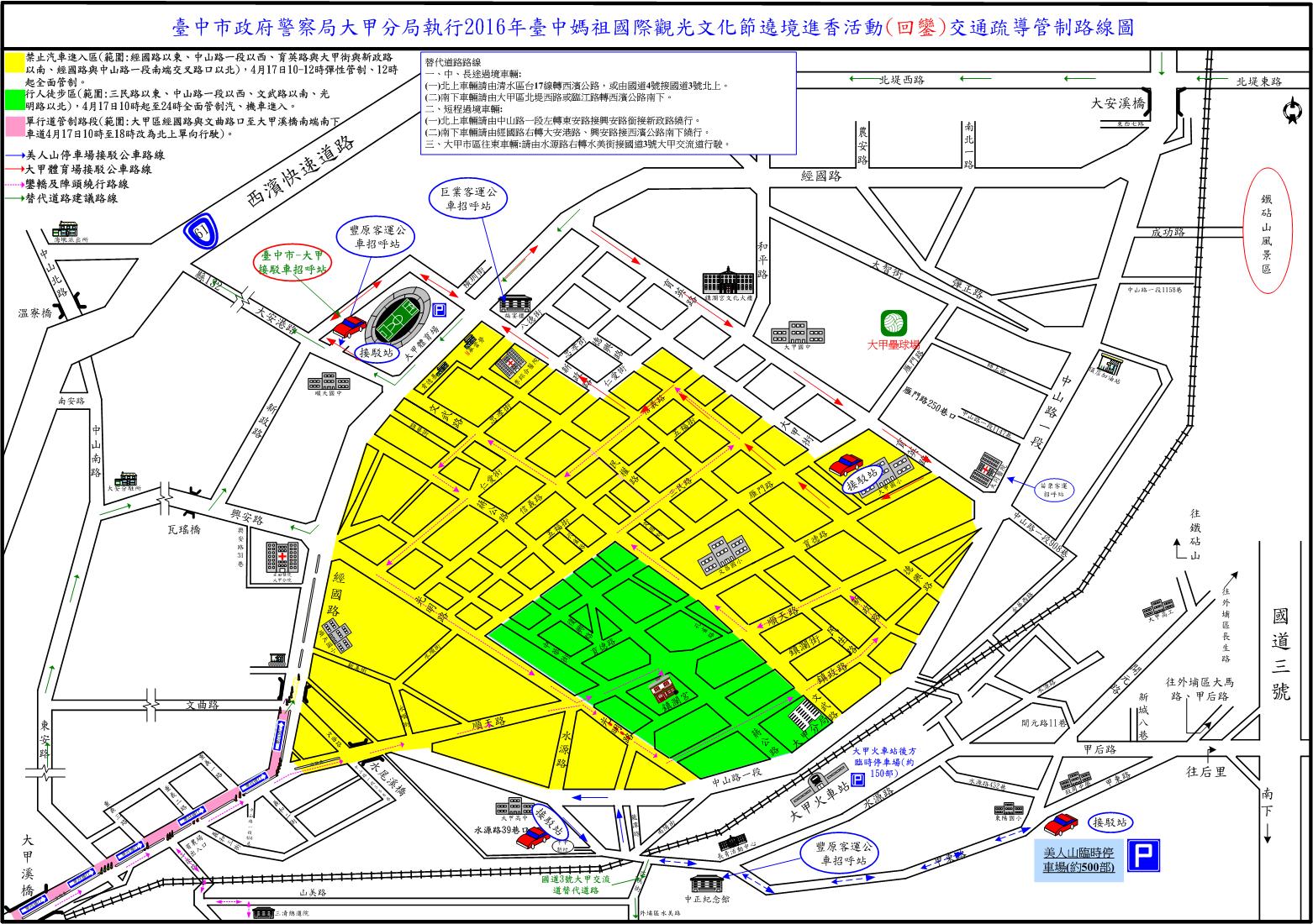 根據交通局管制公告,管制措施及區域分別為,禁止汽車進入區域:大甲區經國路以東、中山路一段以西、育英路(中山路至雁門路段)與大甲街(雁門路至仁愛街路段)與新政路(仁愛街至經國路段)以南、經國路與中山路一段南端交叉路口以北。行人徒步區域:大甲區三民路以東、中山路一段以西、文武路以南、光明路以北,禁止汽、機車進入。單行道管制路段:臺1線大甲溪橋南端至大甲區經國路與文曲路口南下車道改為北上車道,實施往北單行道管制(10-18時視車流狀況彈性調整)。