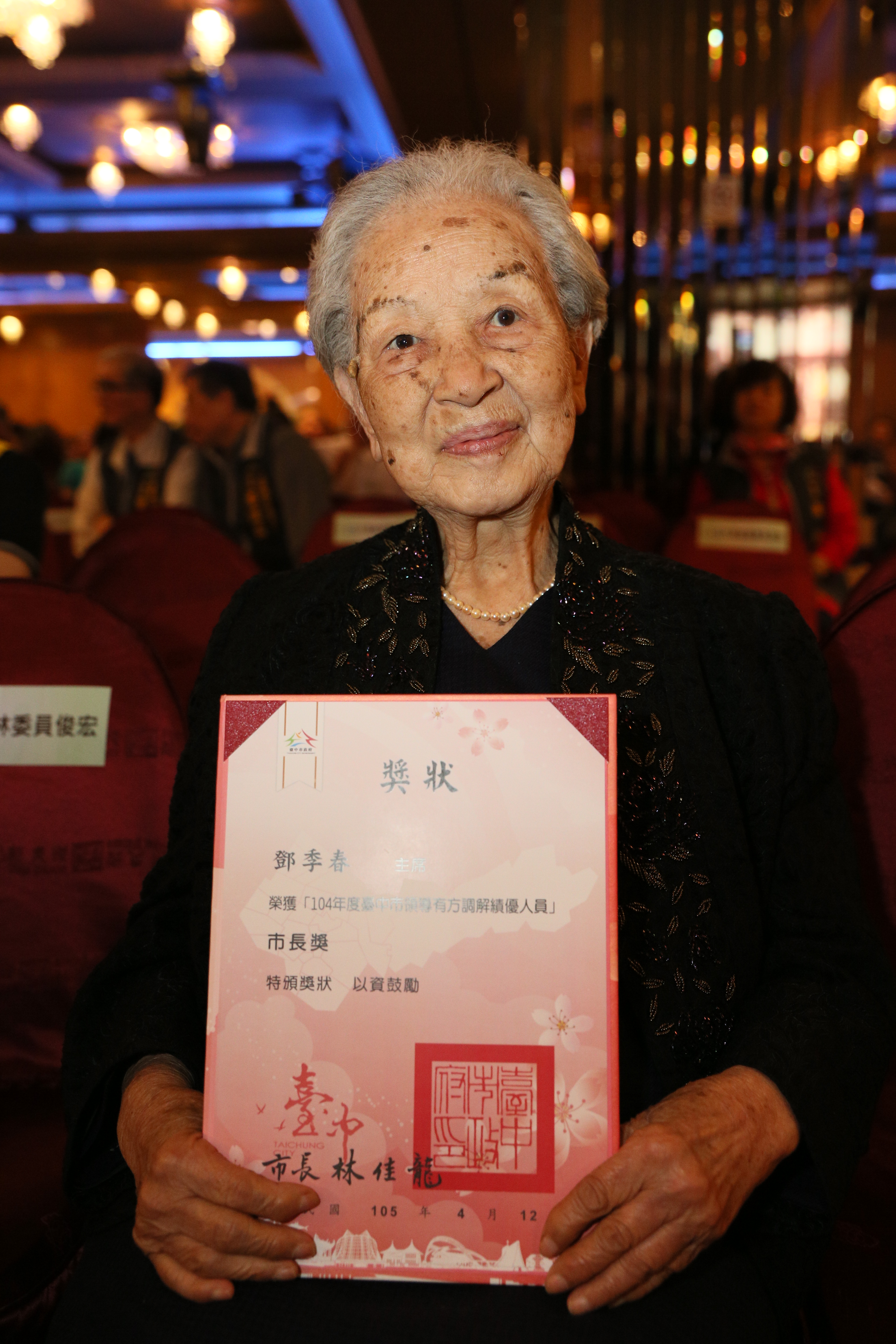 豐原區調解委員會主席鄧季春已97歲高齡,服務年資長達52年,精通日語及英語,她說,最常調解的糾紛是財產、婆媳、妯娌問題;而調解的訣竅就是將心比心、曉以大義,「凡事只要和氣就能解決。」