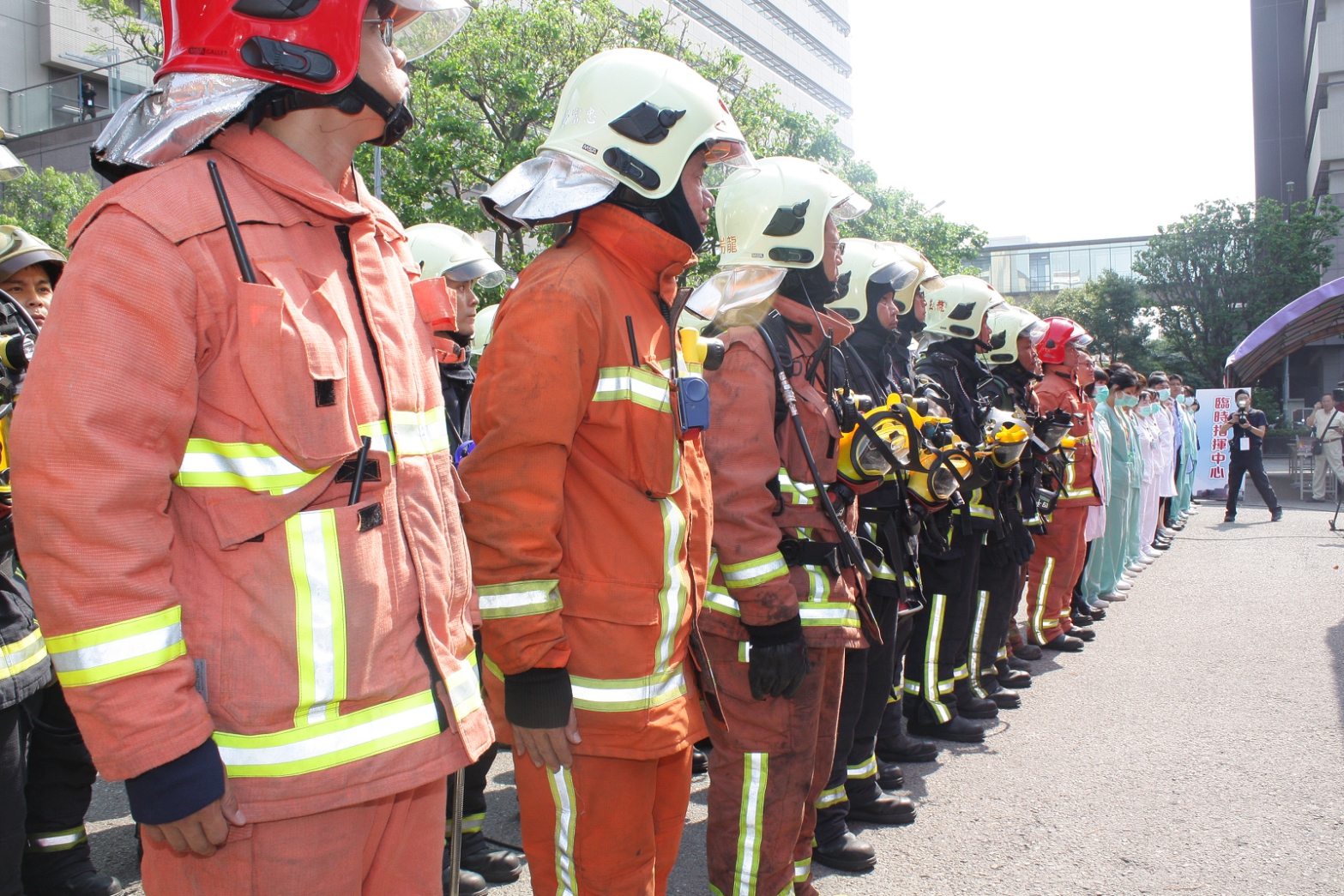 市府消防局今日於中國醫藥大學附設醫院急重症中心大樓實施「105年度醫院火災現場指揮與控制作業演練暨防災訓練」,模擬3樓第一血液透析室電線起火,機構員工隨即通報防災中心,撥打119請消防隊到場救援,結合醫院本身的防火管理制度、自衛消防編組,訓練員工引導病人進行水平、垂直與就地避難應變作為,以及利用機構內消防安全設備滅火、使用防火避難設施等,並訓練火場指揮官即時做出妥適決策。