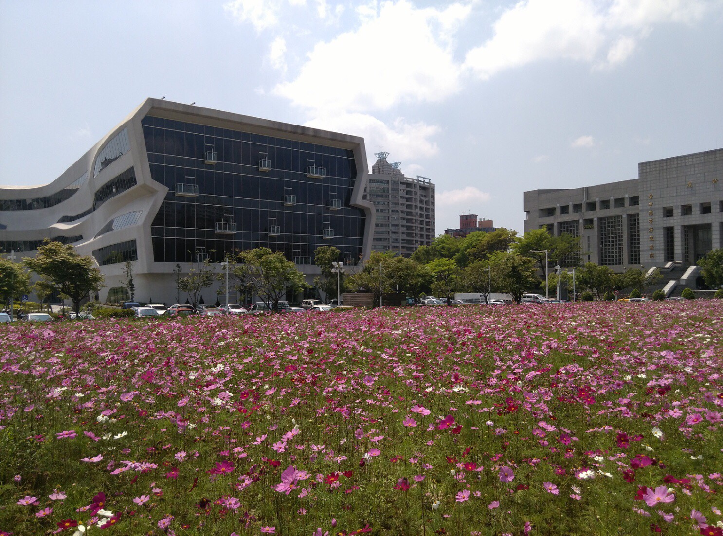 建設局活化國資圖旁的復興建成營地,整片花海桃紅、粉紅、白色點綴其中,上千朵波斯菊綻放,搭配國立公共資訊圖書館曲面造型建築,以及前方高等行政法院雄偉建築,成為攝影熱點。