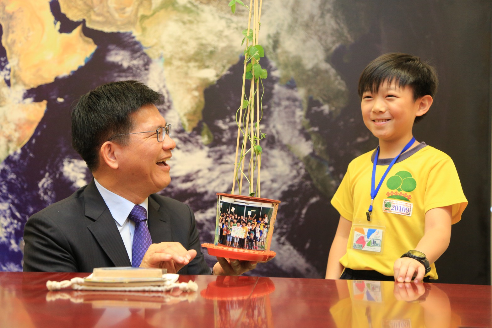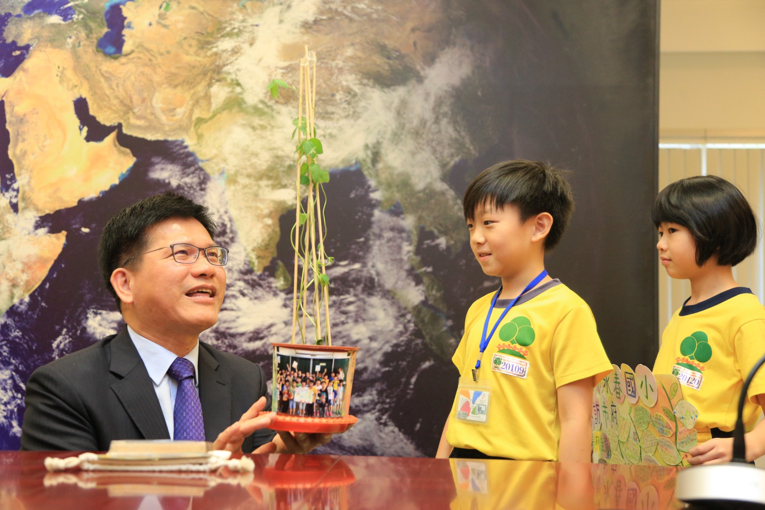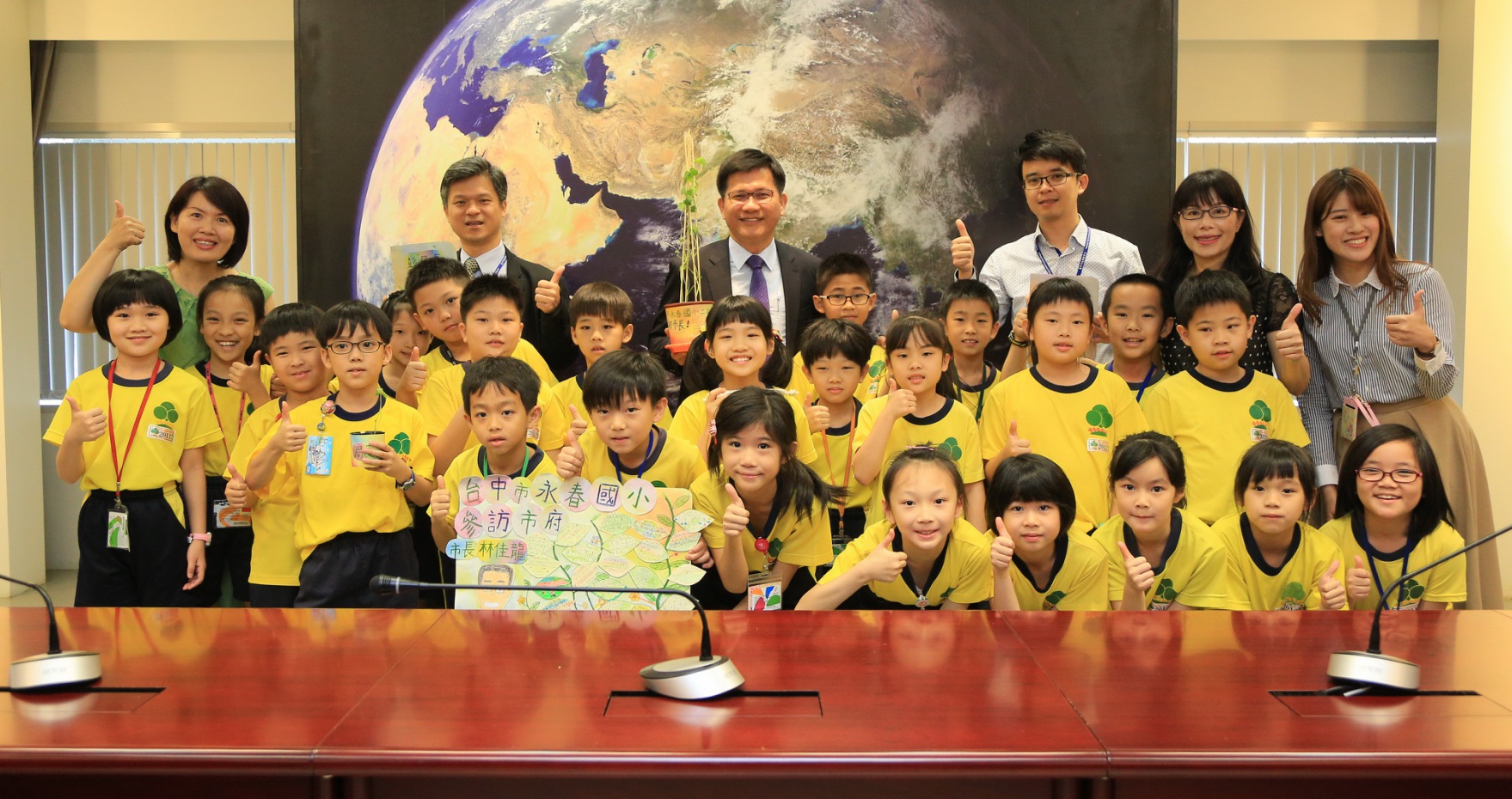 今天27位永春國小學童在校長鄭淑真的帶領下,手持一卡通或悠遊卡,享受10公里免費公車優惠,來到台灣大道市政大樓參訪。市長林佳龍在教育局長彭富源的陪同下與學童們相見歡;小學生送上課堂共同栽種的黑豆盆栽,與林市長分享豆苗成長的喜悅;林市長則回贈七巧板,盼學童認識形的概念、長度與簡單圖形,運用視覺、聽覺、動覺的藝術創作形式,表達自己的感受和想法。