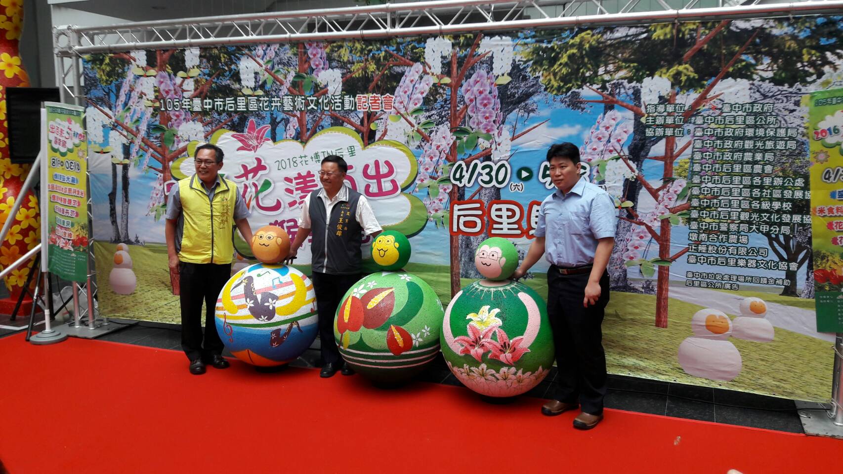 為持續行銷后里花卉,公所這周六起舉辦「后里區花卉藝術文化活動」,主題為「花漾百出 猴幸福」與「2018世界花博in后里」,展示五彩繽紛的花卉,現場並邀請國內知名的磐宇木偶劇團,表演年度大戲「媽祖治貪官」,還有小朋友遊戲區、創意DIY活動、米食饗宴、葡萄釀品嚐、農特產品展售及精采的舞台表演等,歡迎大家共襄盛舉。(4/26*13)*農業局